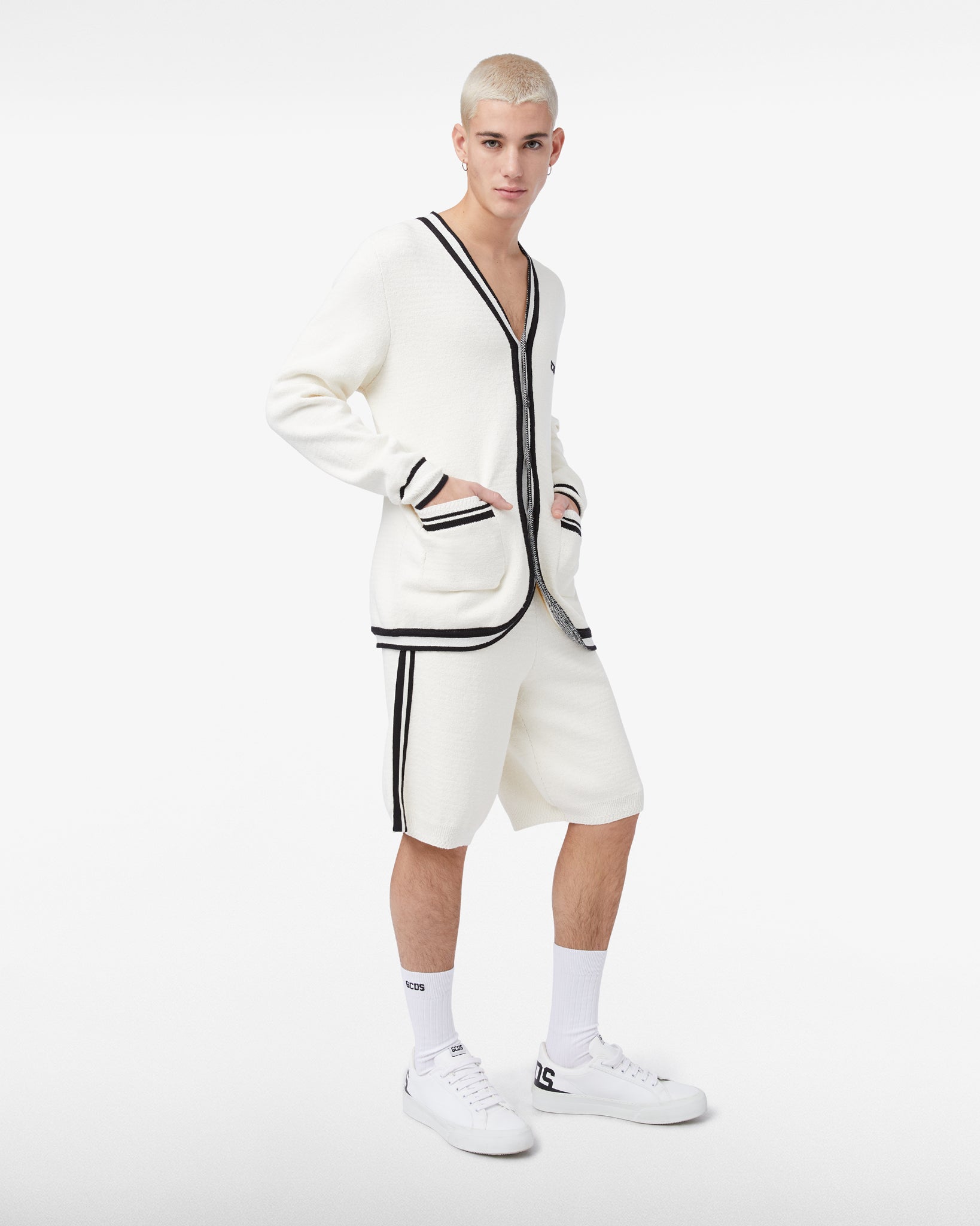 Knitted bermuda shorts made of cotton blend. Adjustable elastic waistband with tone-on-tone inner drawstring. Front welt pockets. Ribbed hems and contrasting striped piping. Regular fit.