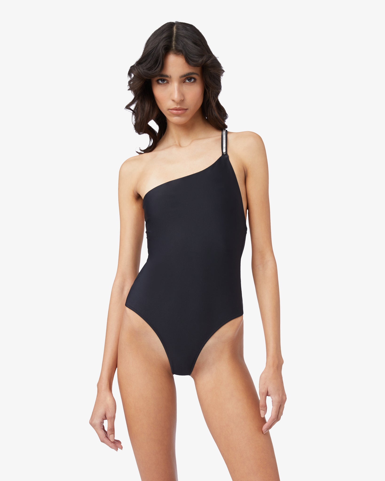 One-shoulder one-piece swimsuit with asymmetrical cut. Left shoulder strap with ribbon and rhinestone chain. Deep neckline on back enriched with GCDS metalized openable logo clip detail.