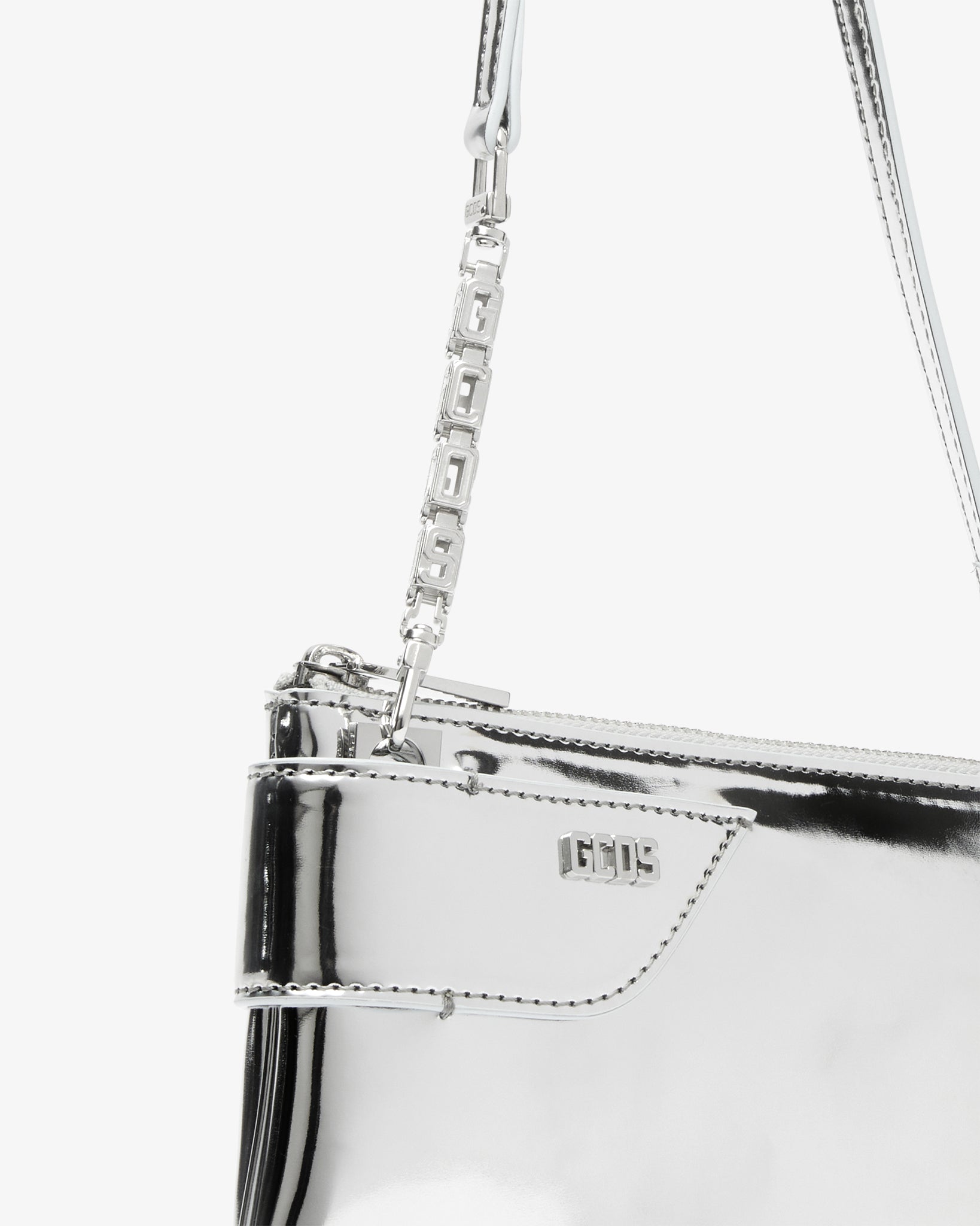 Removable thin handle in metalized "GCDS Cube" chain module. Internally, ecru jacquard logo lining and asymmetrical card pocket.