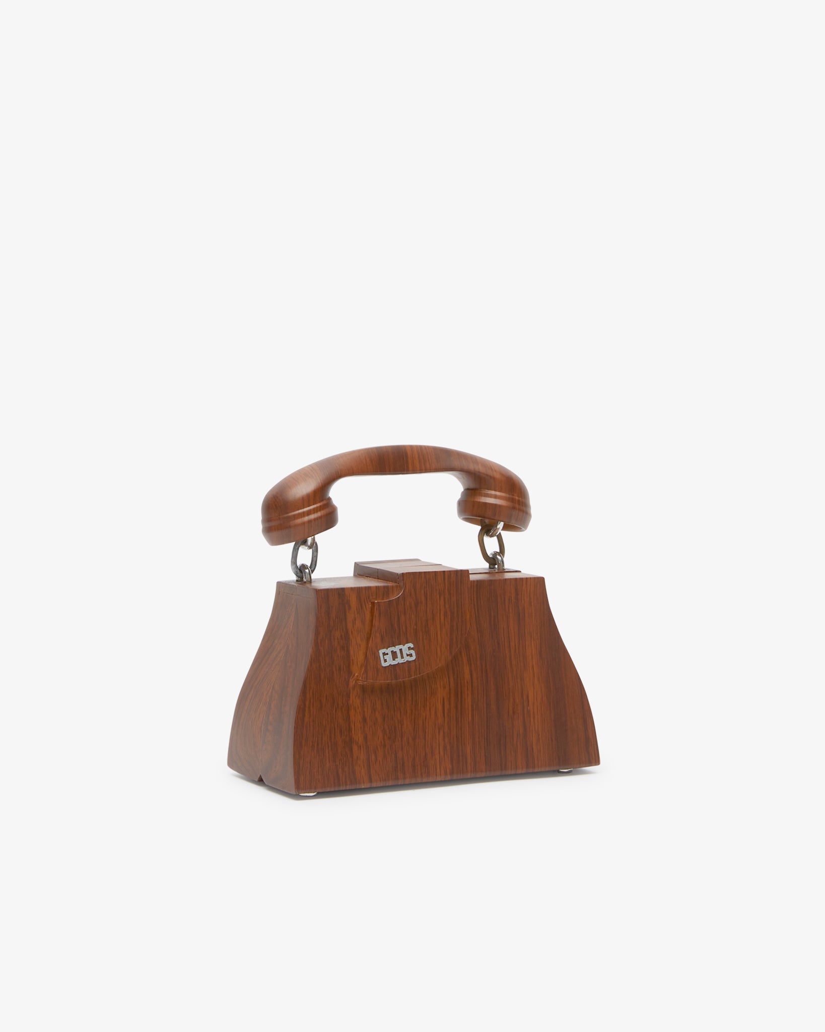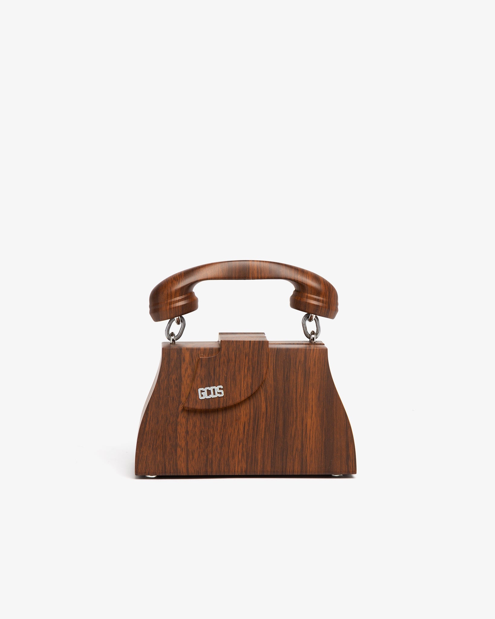 Skip to contentCall-Me Comma bag, small size, made of wood-effect acrylic with distinctive flared shape. Magnetic snap closure. Characterised by an asymmetrical fixed flap. The distinctive feature of the bag is the cornet-shaped handle.