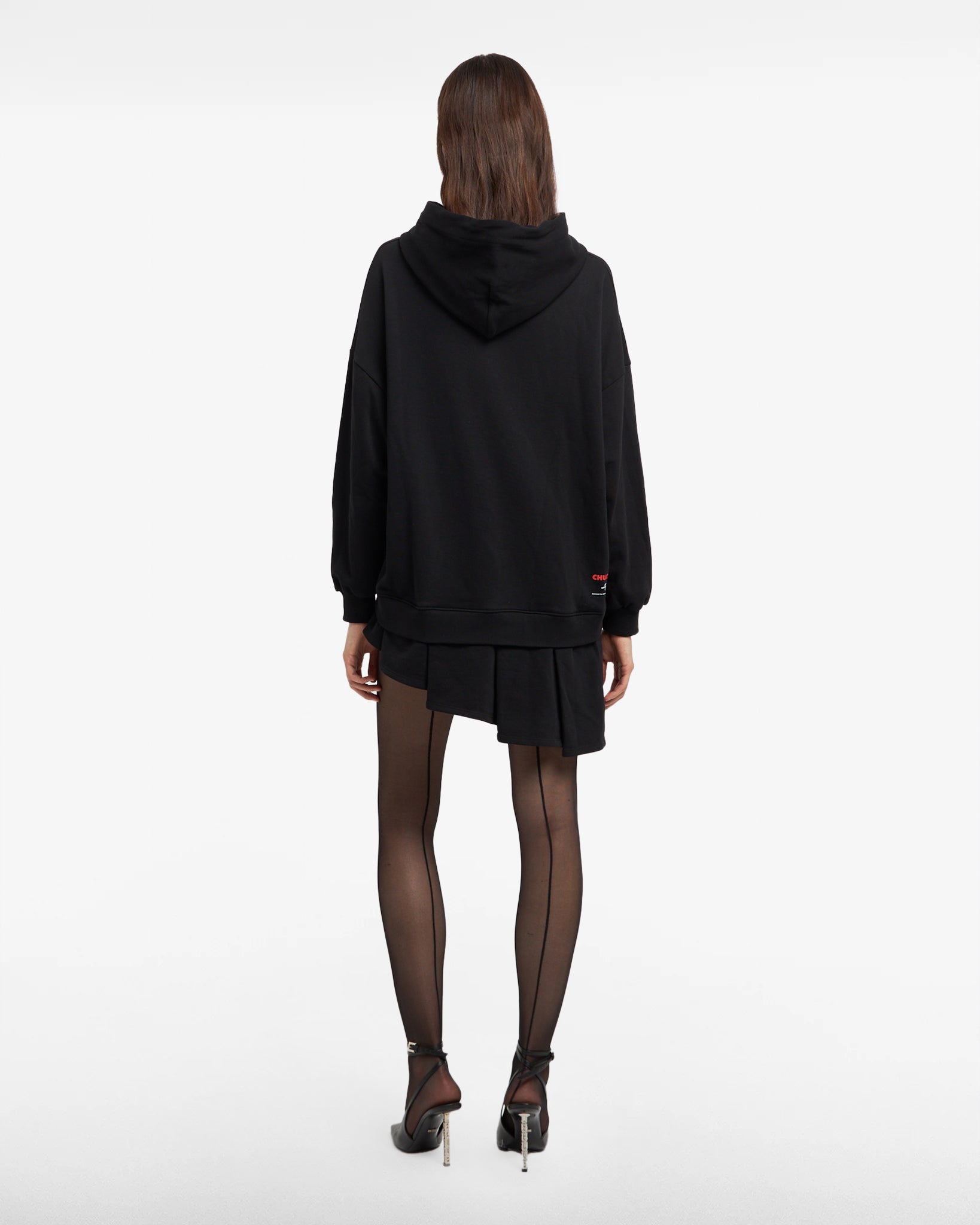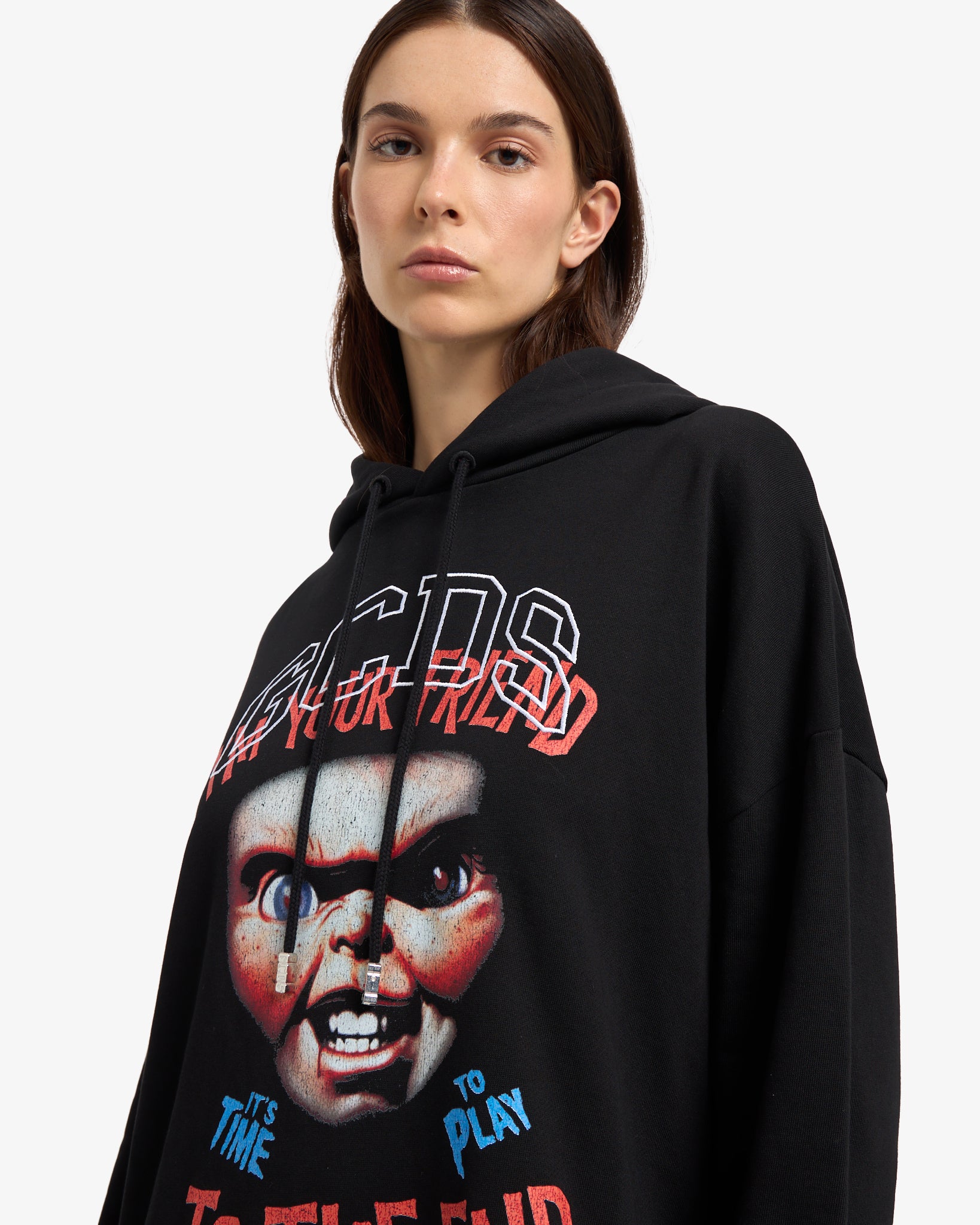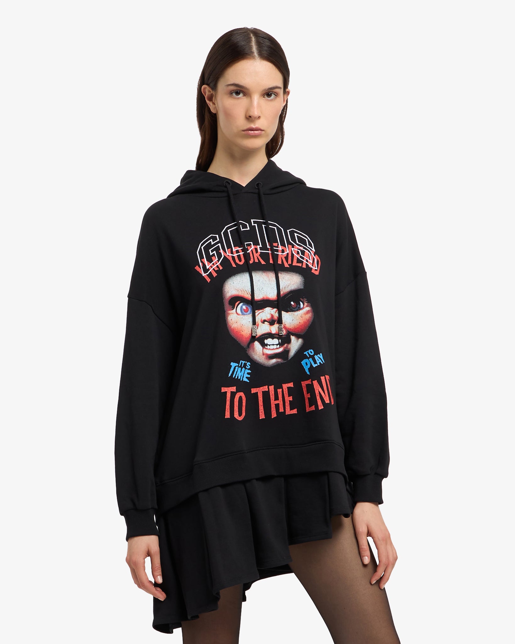 Cotton fleece hoodie dress featuring an asymmetric pleated mini skirt. This piece showcases a screen-printed Chucky design and GCDS embroidery.