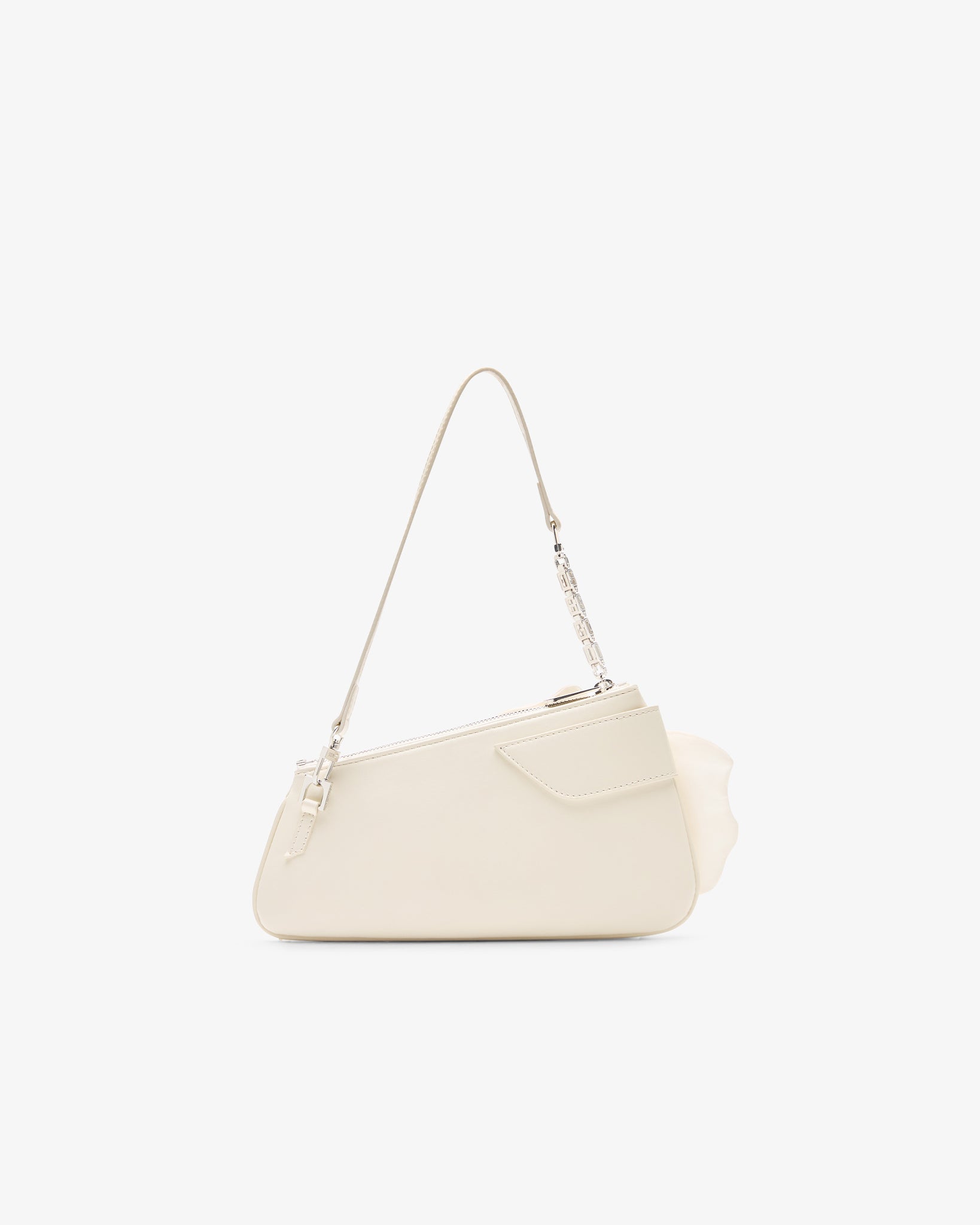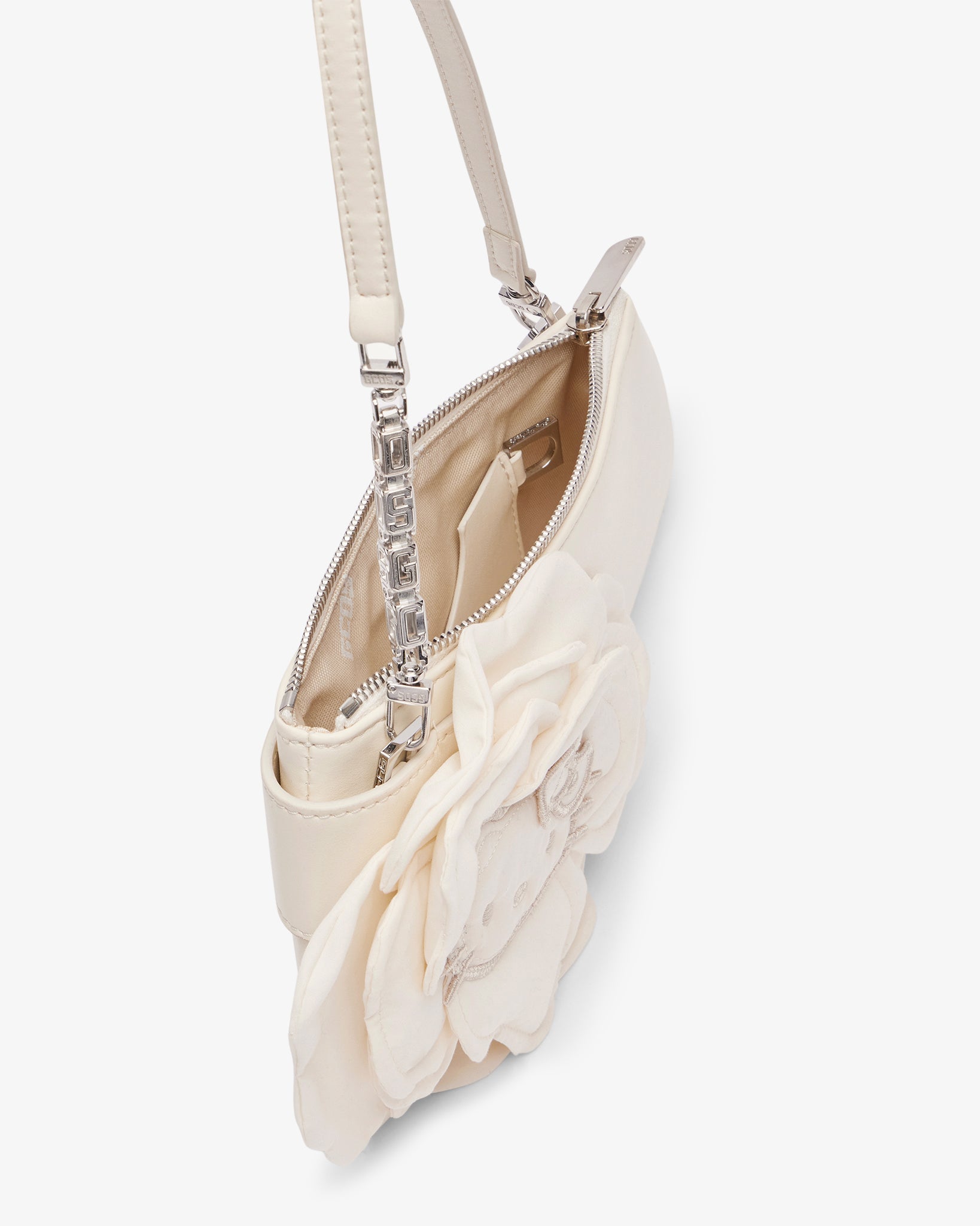 Comma Notte bag, small size, made of "sintetico" leather. Asymmetric silhouette enhanced by tone of tone leather piping and cream leather metallic details. Removable thin calfskin leather handle with metalized "GCDS Cube" chain module. Internally, ecru jacquard logo lining and asymmetrical card pocket. On the flap is a 3D embroidery depicting a stuffed flower with Hello Kitty in the center.