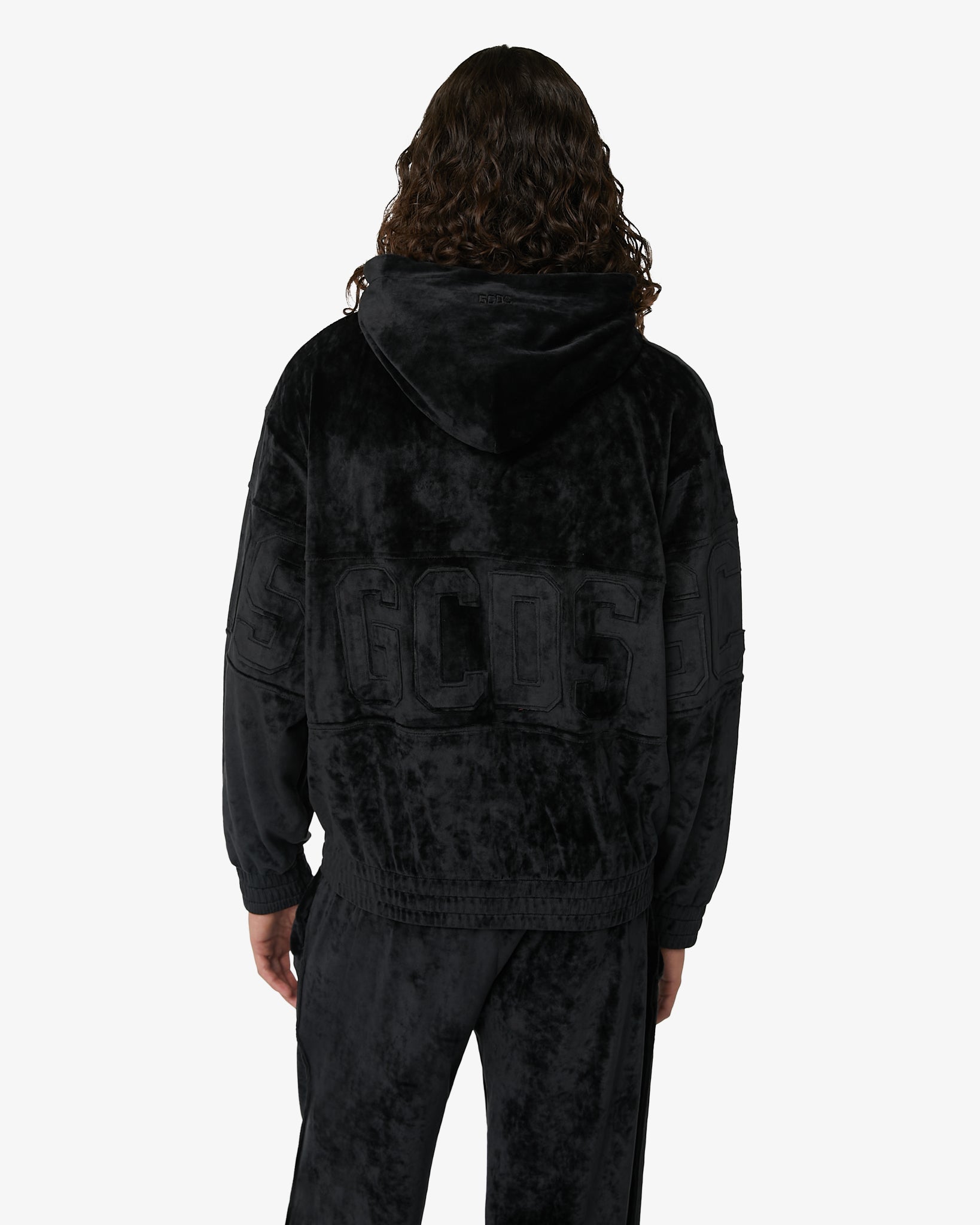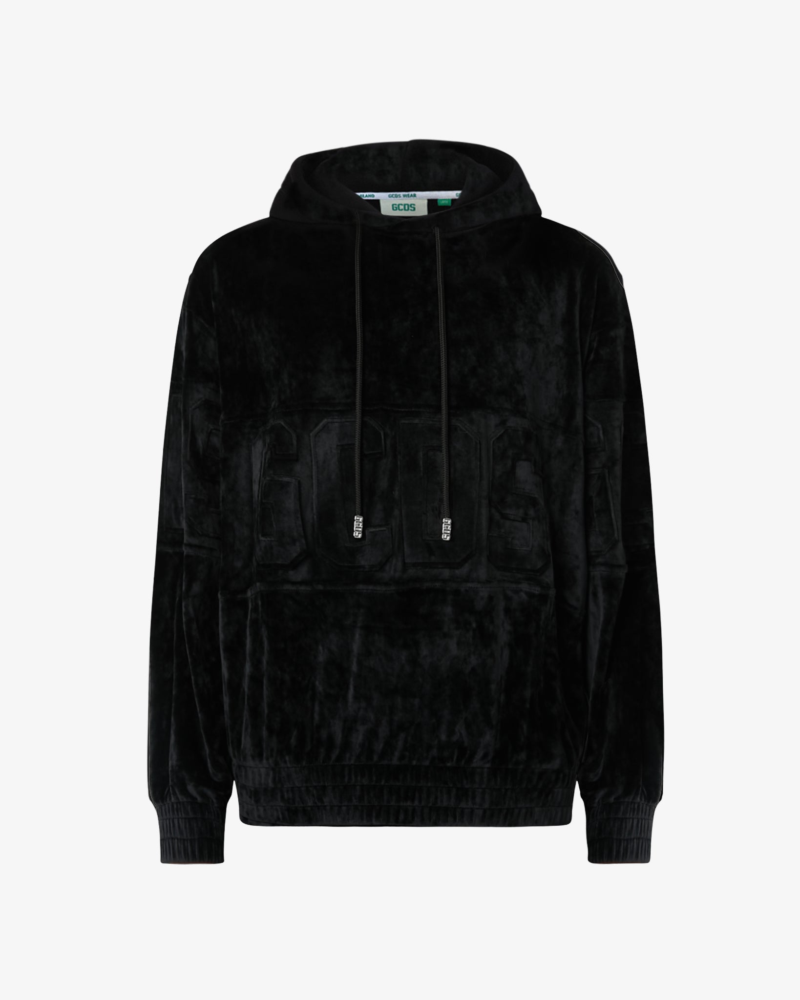 Hoodie loose fit made from a velvety fabric. It features a subtle tonal GCDS logo, polished nickel logo cord aglet, and a ribbed finish on the cuff and bottom hem.