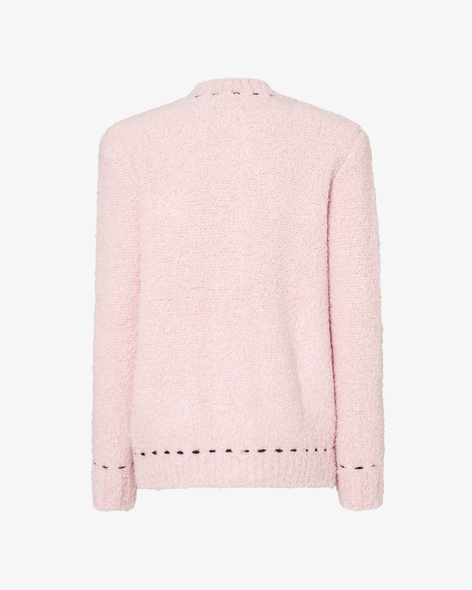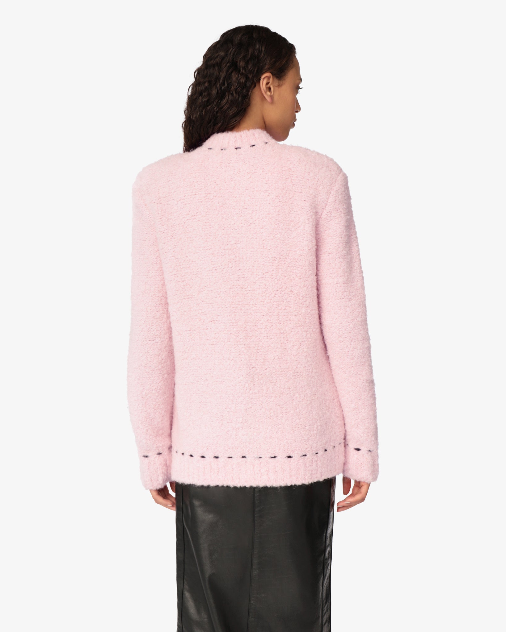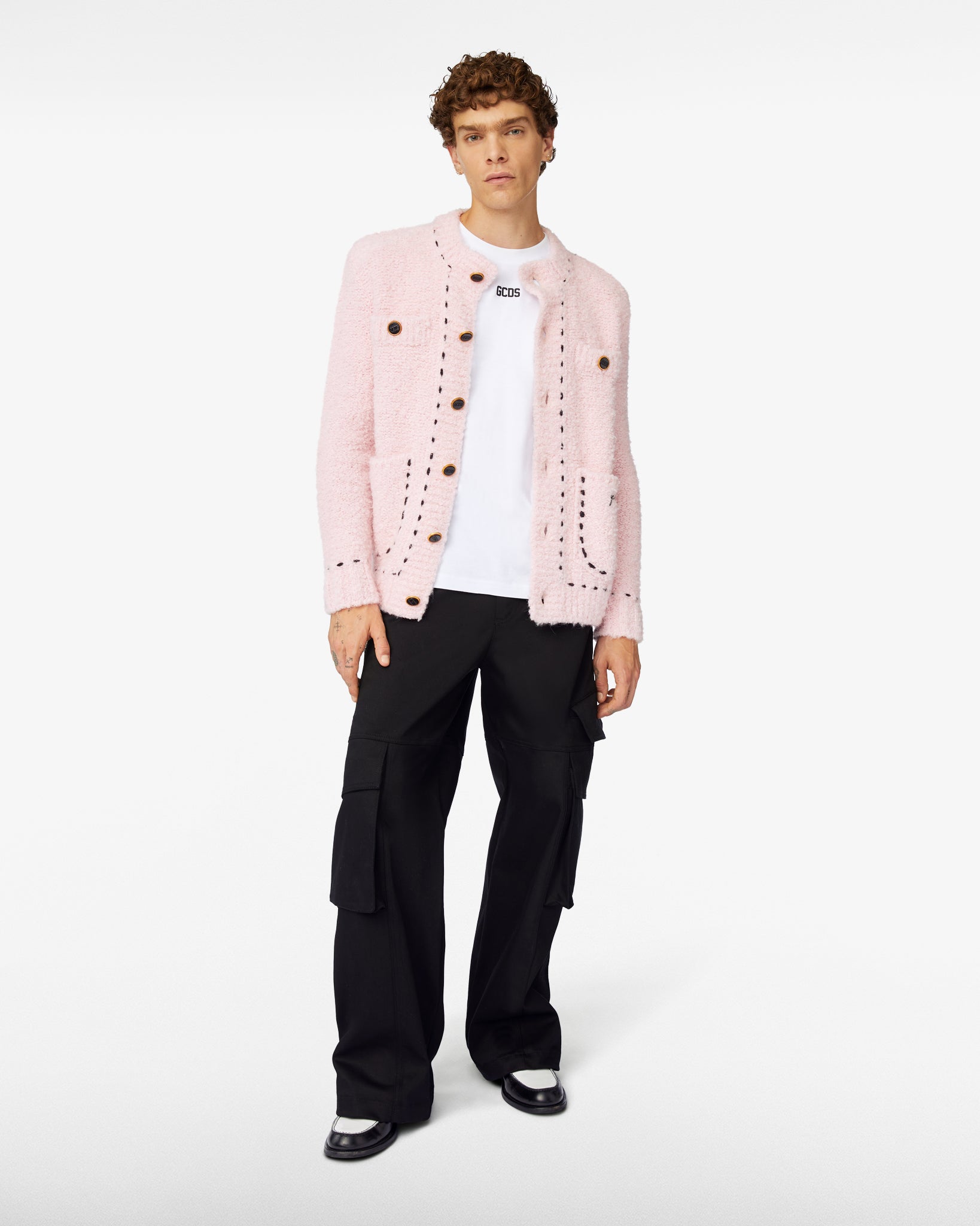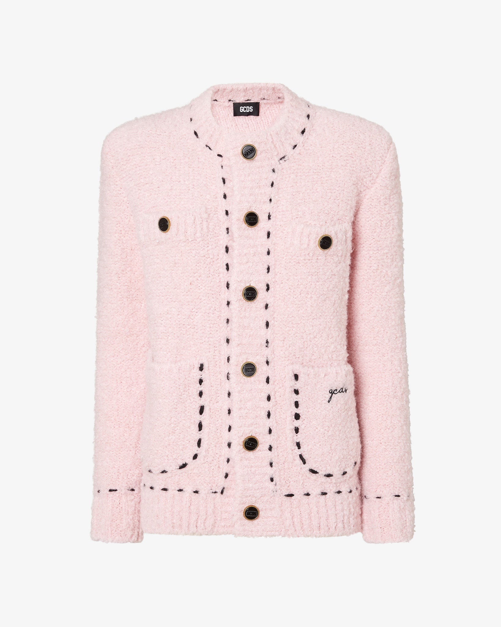 Regular-fit bouclé knit jacket. Round neck and long sleeves. Front closure with mother-of-pearl logo buttons. The garment features contrasting embroidered topstitching and ribbed hems. Front patch pockets and embroidered GCDS logo. It is a perfect addition to any wardrobe.