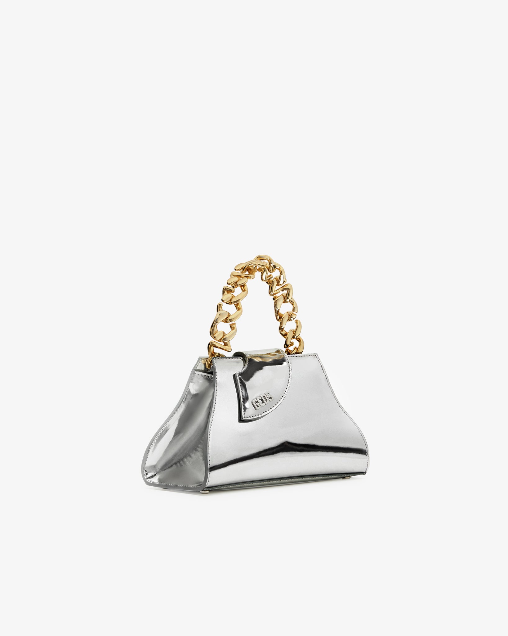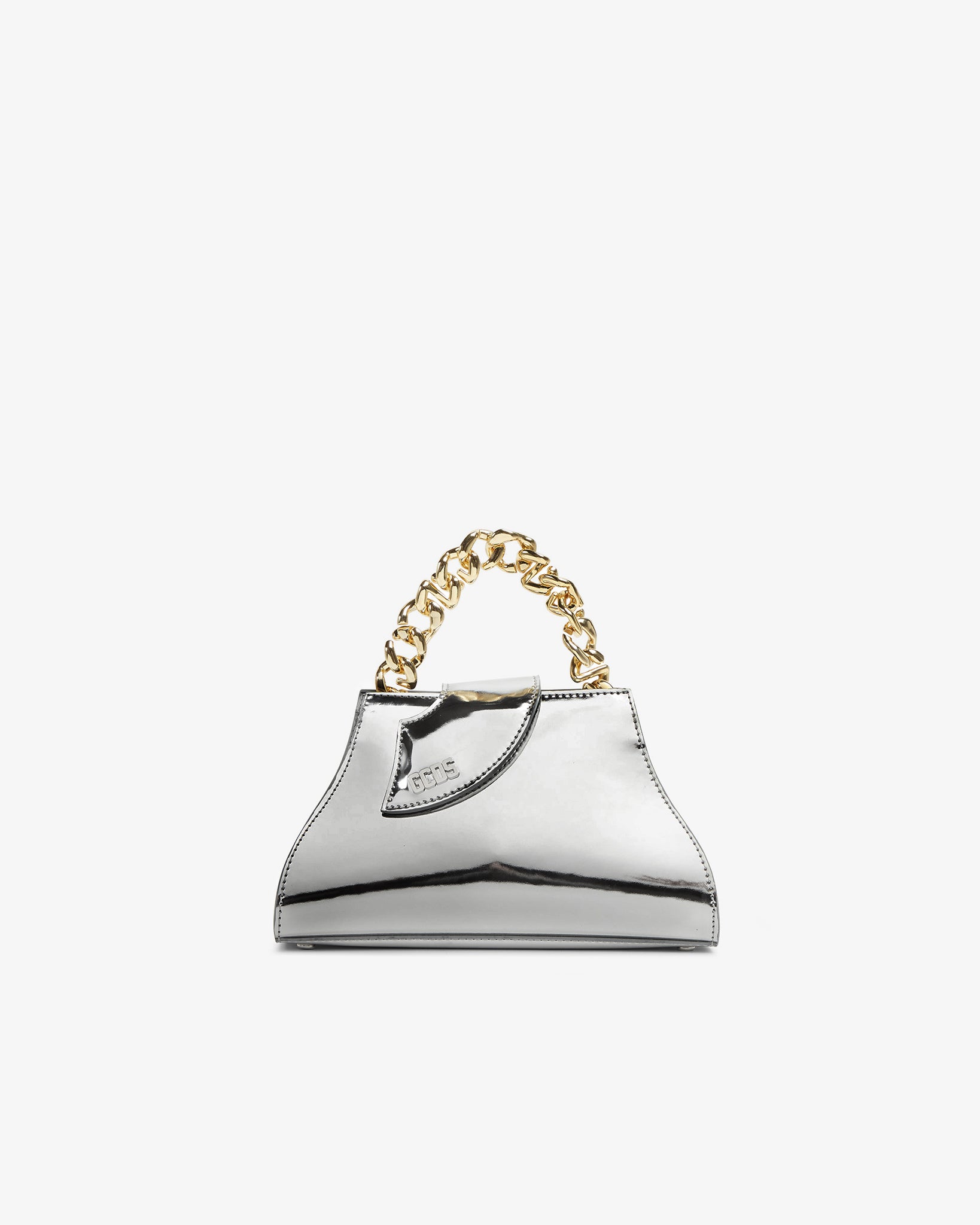 Asymmetrical curved flap with golden GCDS logo on the end and magnetic button. Handle with contrasting shiny gold GCDS logo chain. Jacquard logo lining in ecru and cardholder pocket with heat-embossed logo on the inside. Bottom with 4 polished nickel feet.