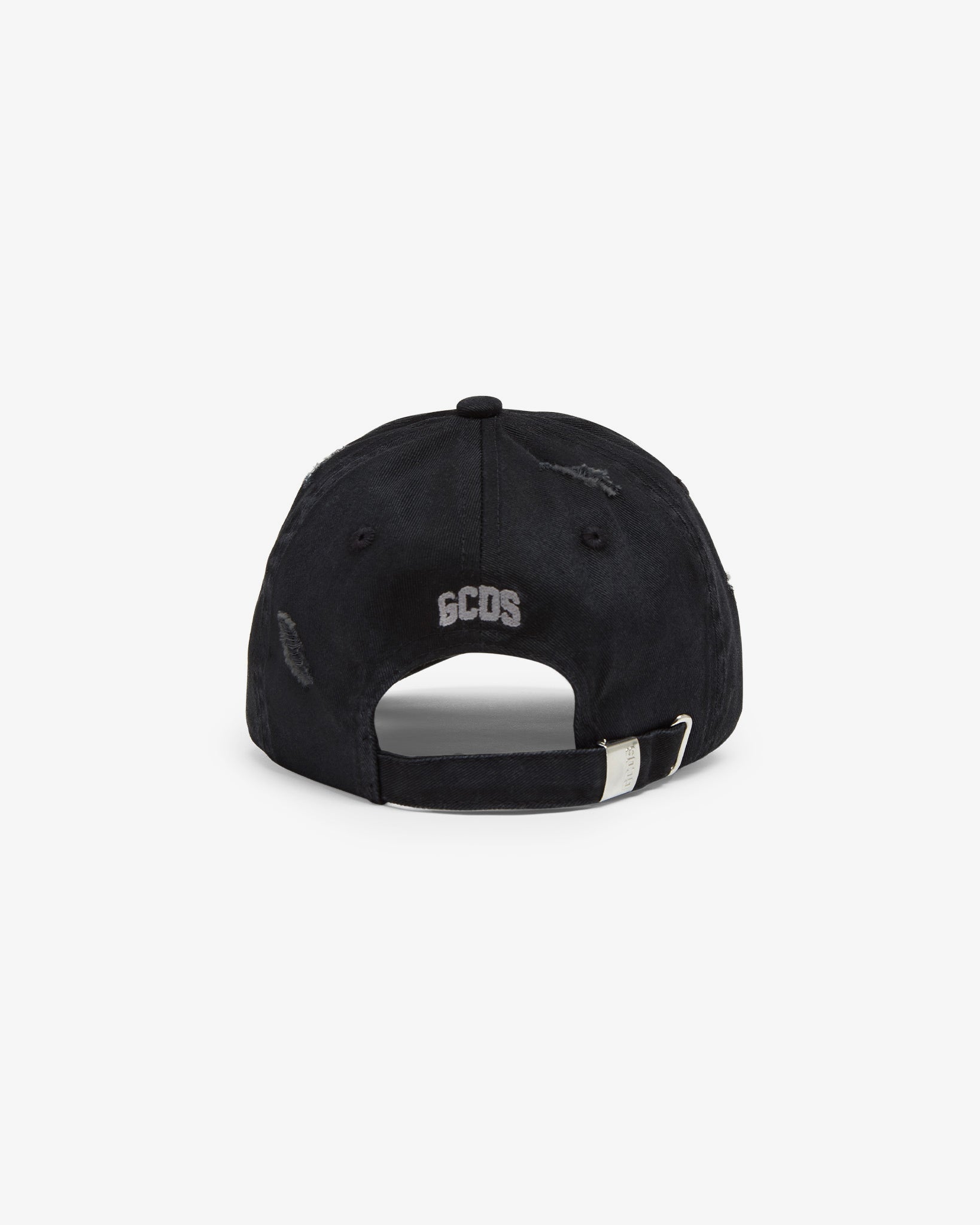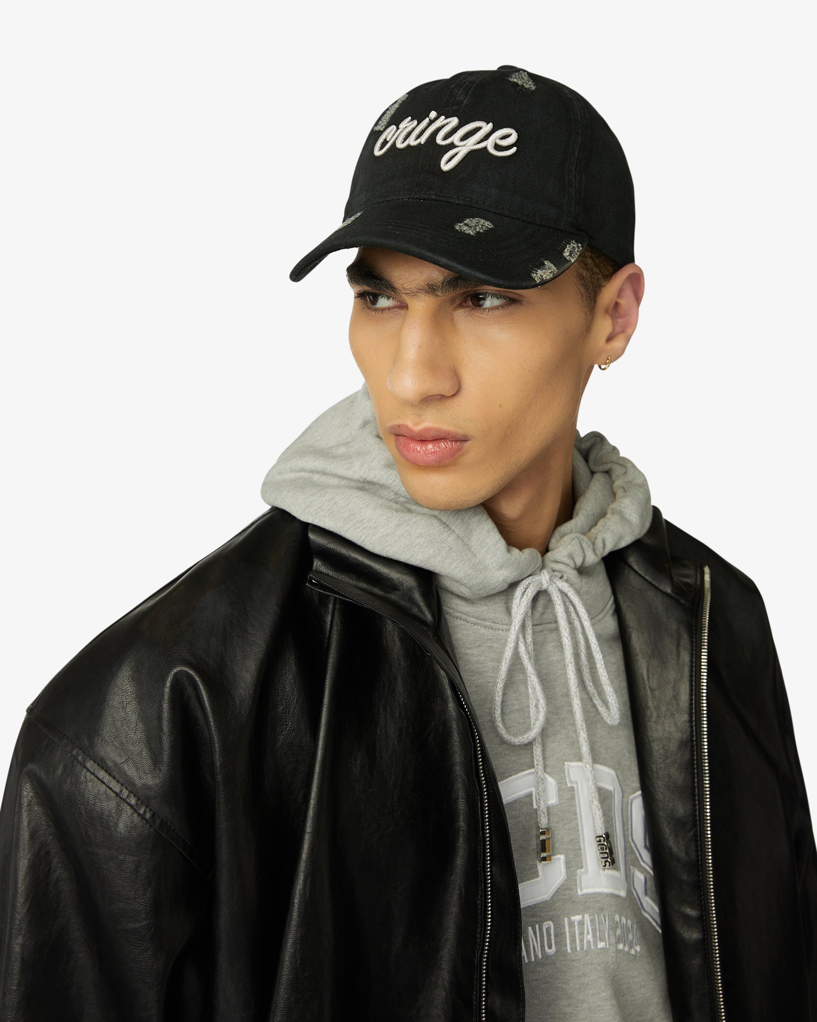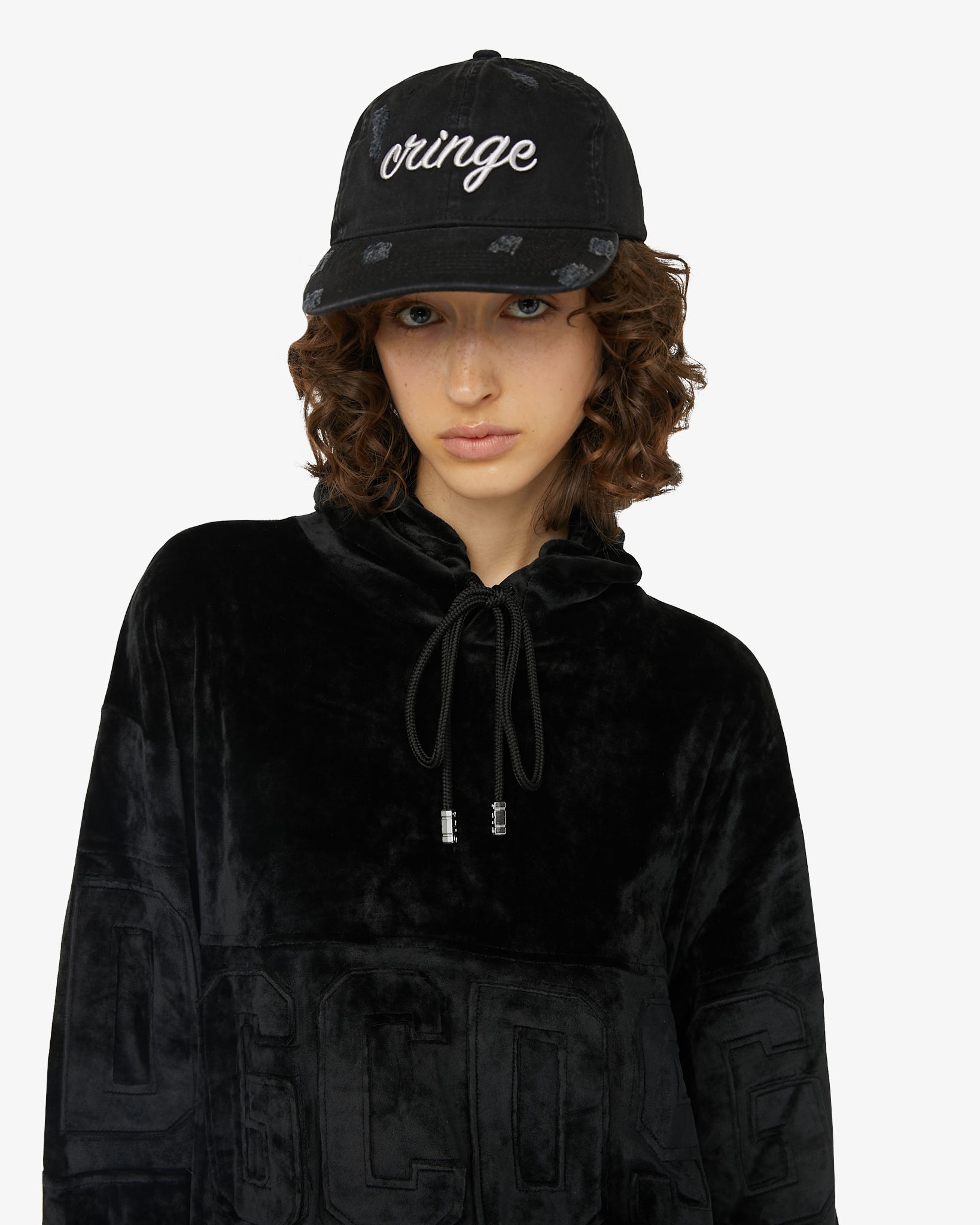 Cotton gabardine baseball cap with visor. Contrasting embroidered Cringe lettering and scattered breaks. Adjustable at the back.