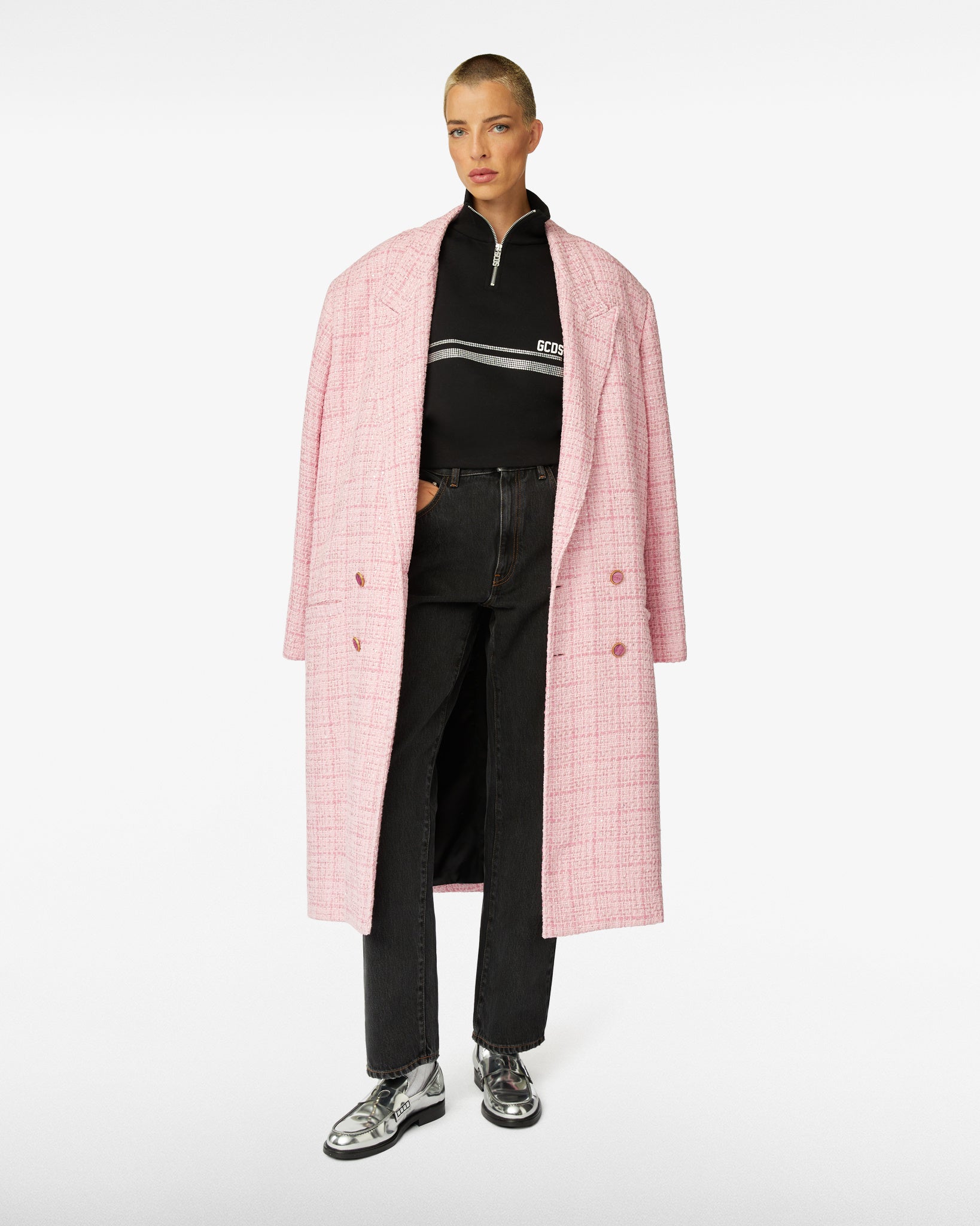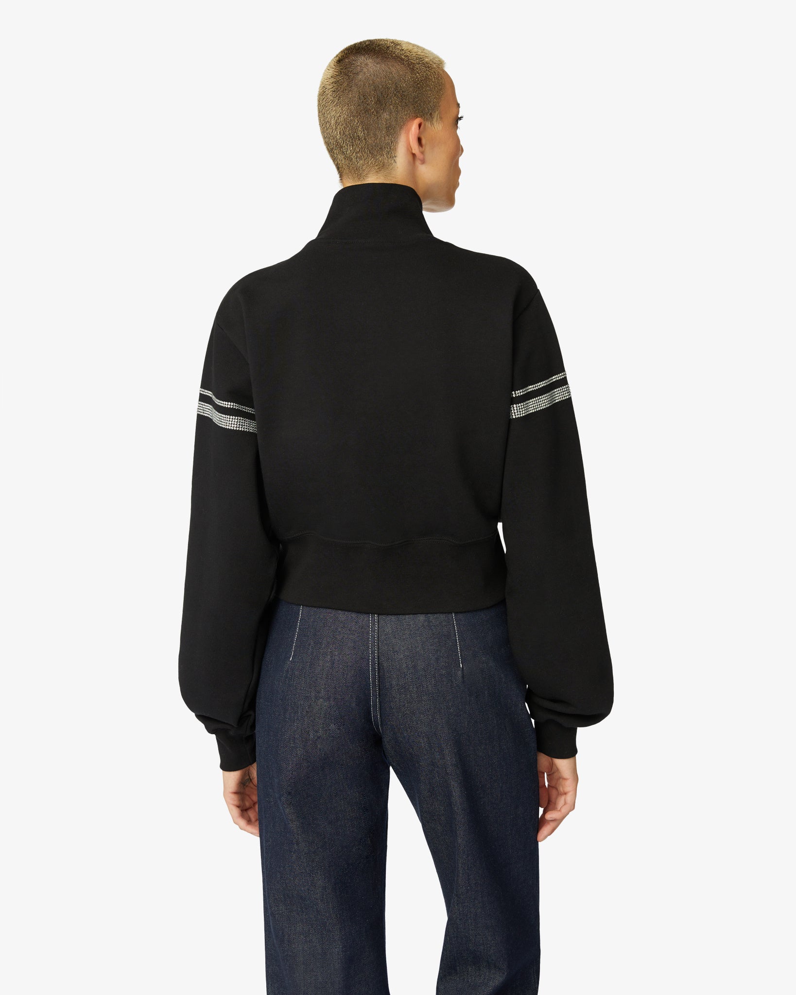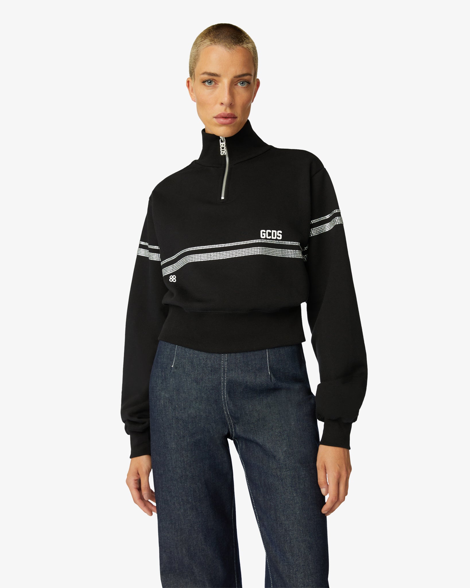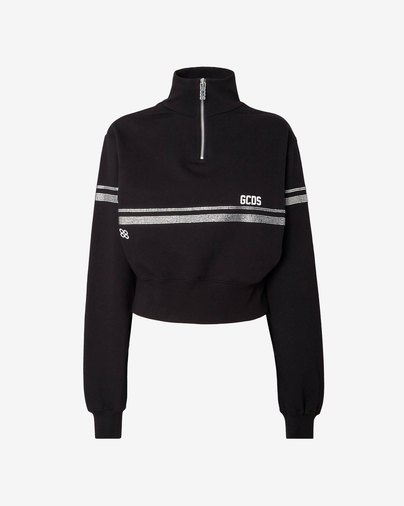 Cotton jersey hoodie with high neck and crop cut. “GCDS Stripes” artwork and heat-applied rhinestones on the front, back and sleeves. Thick GCDS and “GCDS Bliss” transfer logo print on the front.