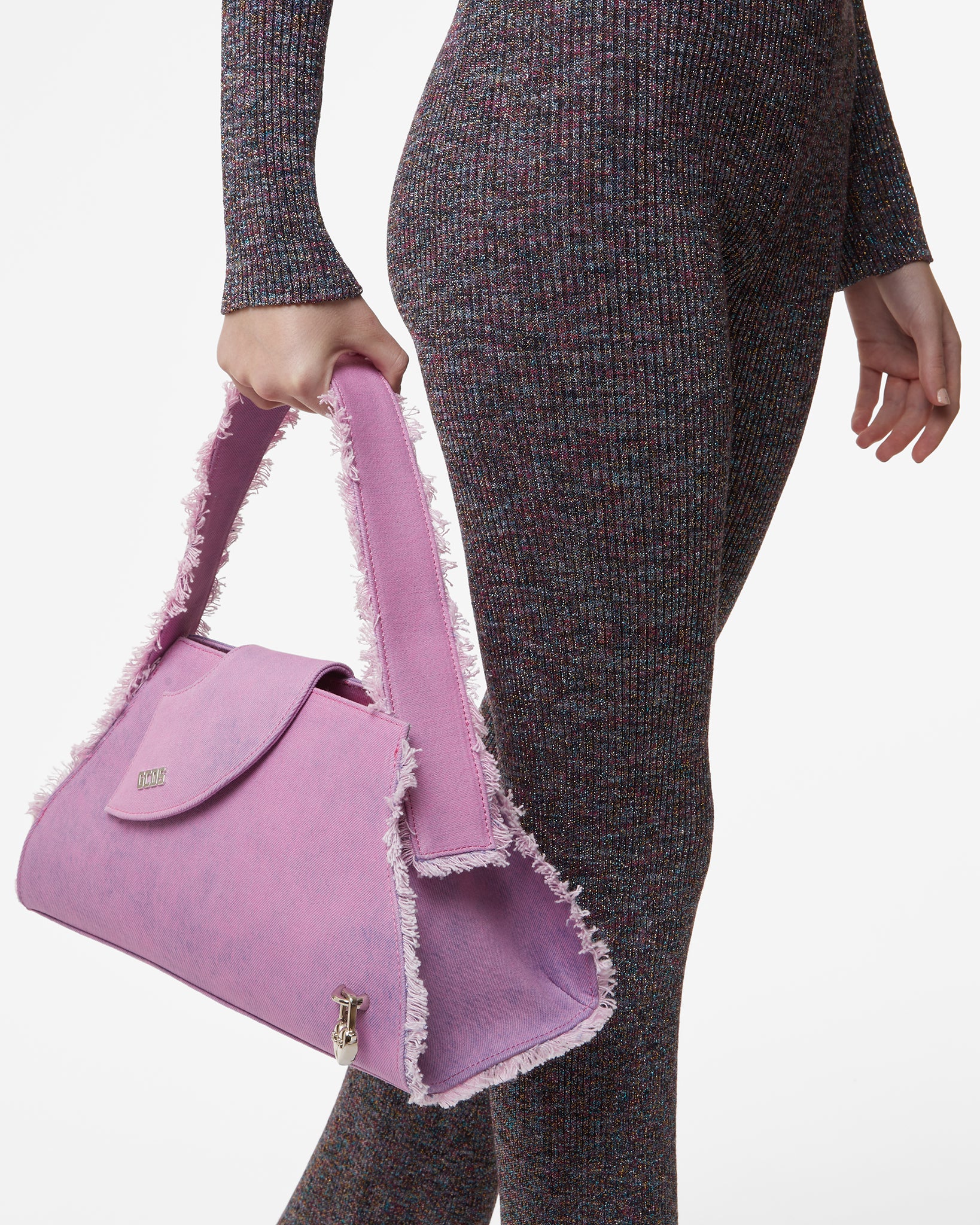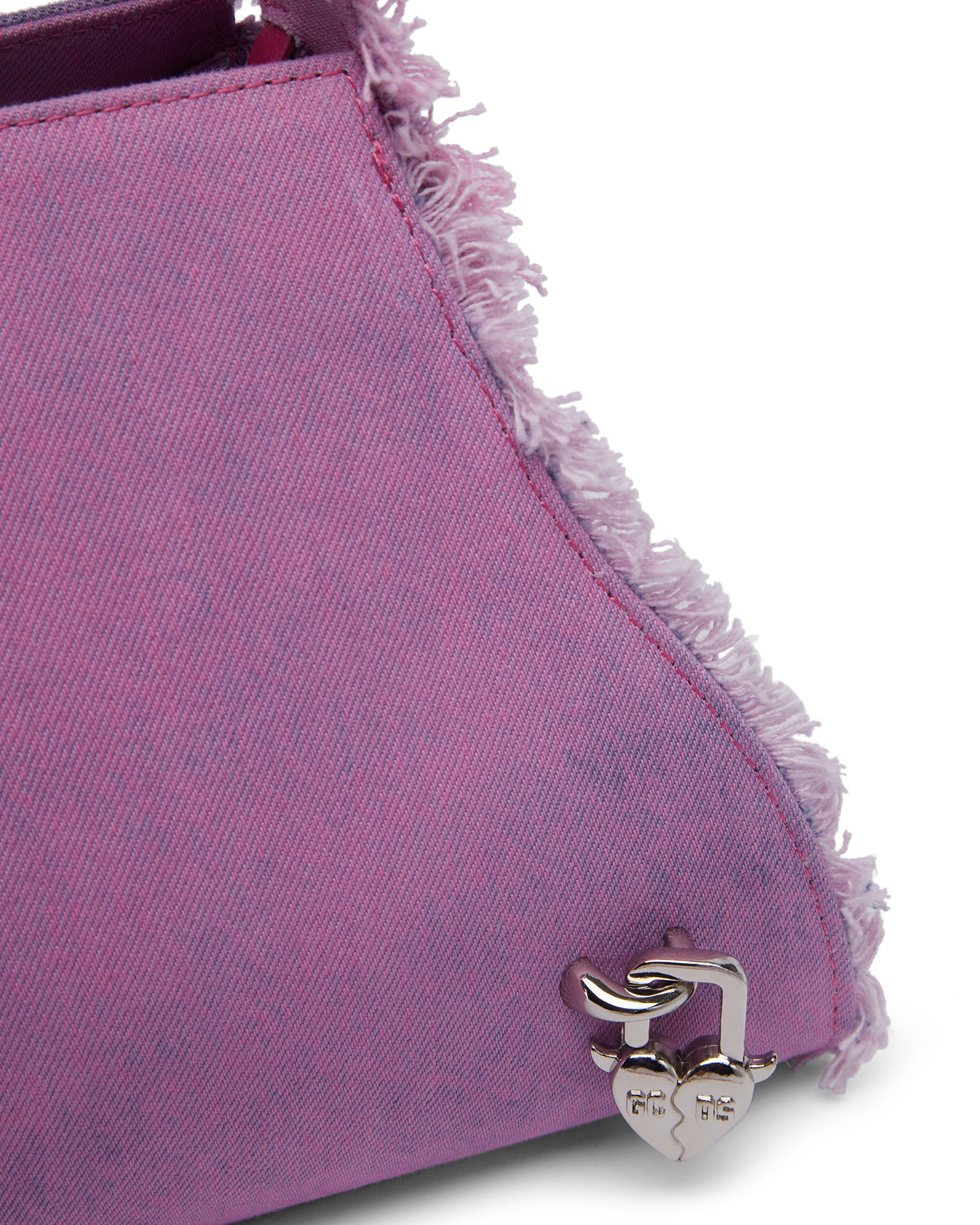 Medium flare-shaped overdyed bleached denim comma bag with a distressed effect. Asymmetrical curved flap with polished nickel GCDS logo on the end and magnetic button. Denim handle with semi-hidden snap hooks. GCDS “piercing cuore” snap hooks may be attached to the eyelets on the handle and bottom of the bag. Jacquard logo lining and card holder pocket with heat-embossed logo on the inside. Denim bottom with 5 polished nickel feet.