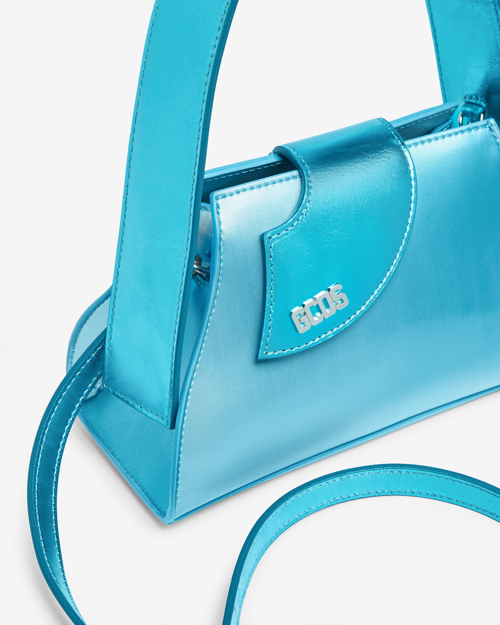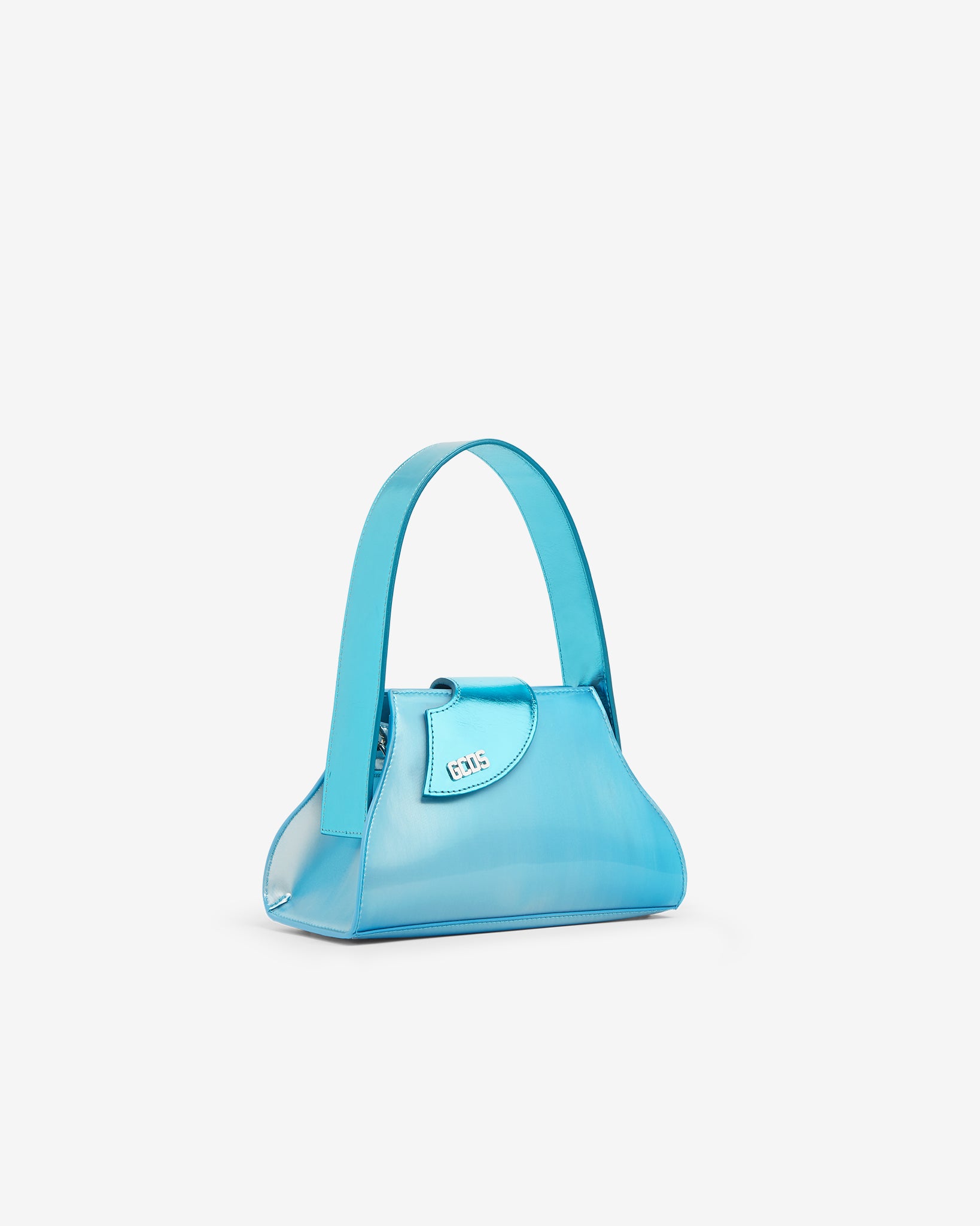 Holographic synthetic medium flare-shaped comma bag. Asymmetrical lamé leather curved flap with polished nickel GCDS logo on the end and magnetic button. Lamé leather handle with semi-hidden snap hooks. Jacquard logo lining and card holder pocket with heat-embossed logo on the inside. Bottom with 4 polished nickel feet.