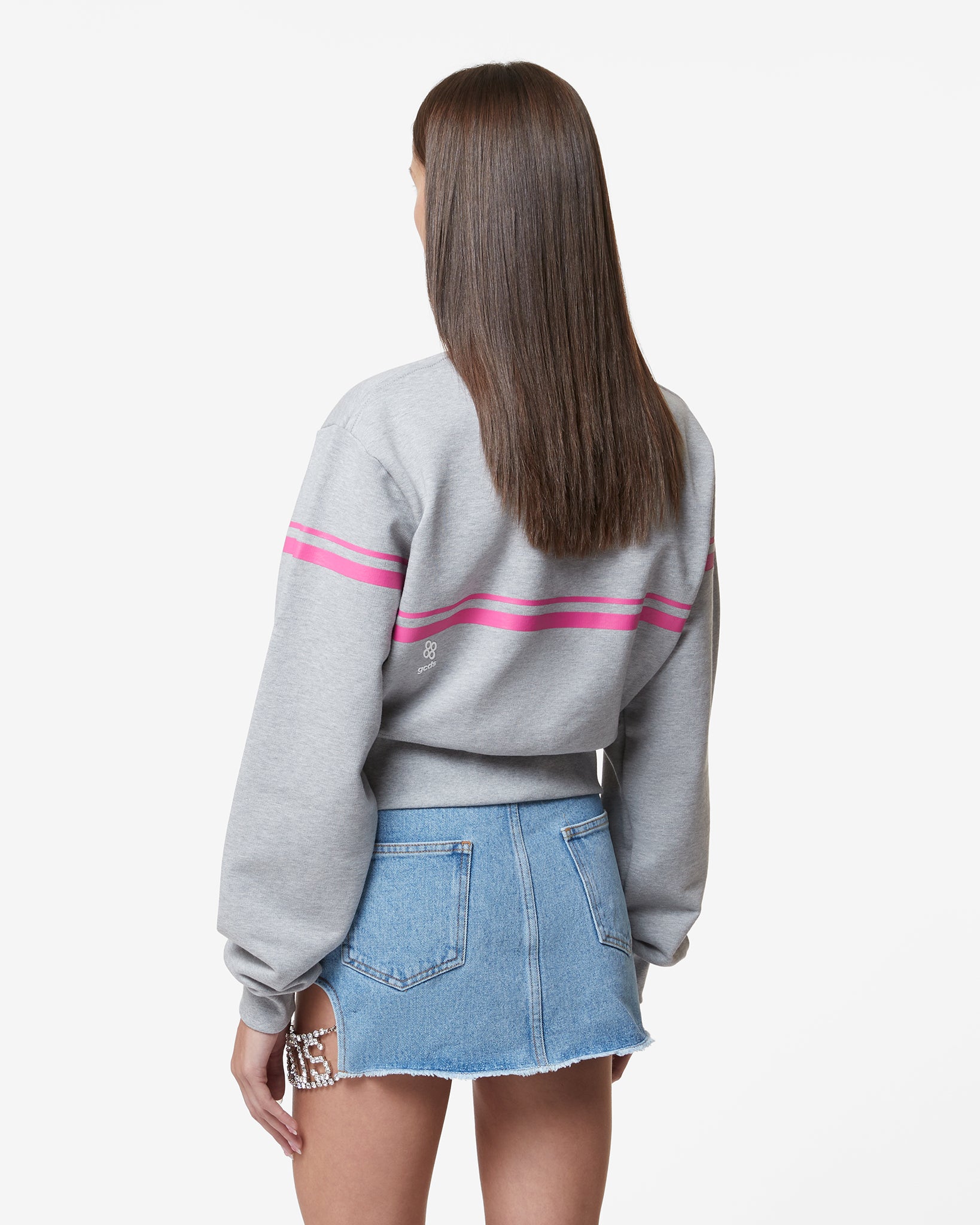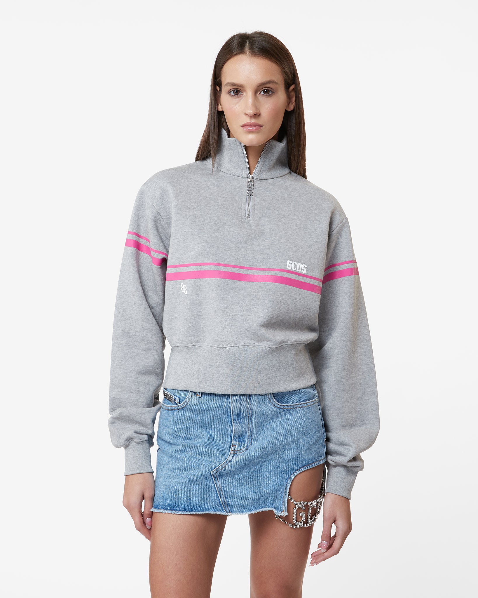 High-necked cotton half zip. Cropped. “GCDS Stripes” artwork print on the front, back and sleeves. Thick GCDS and “GCDS Bliss” transfer logo print on the front.