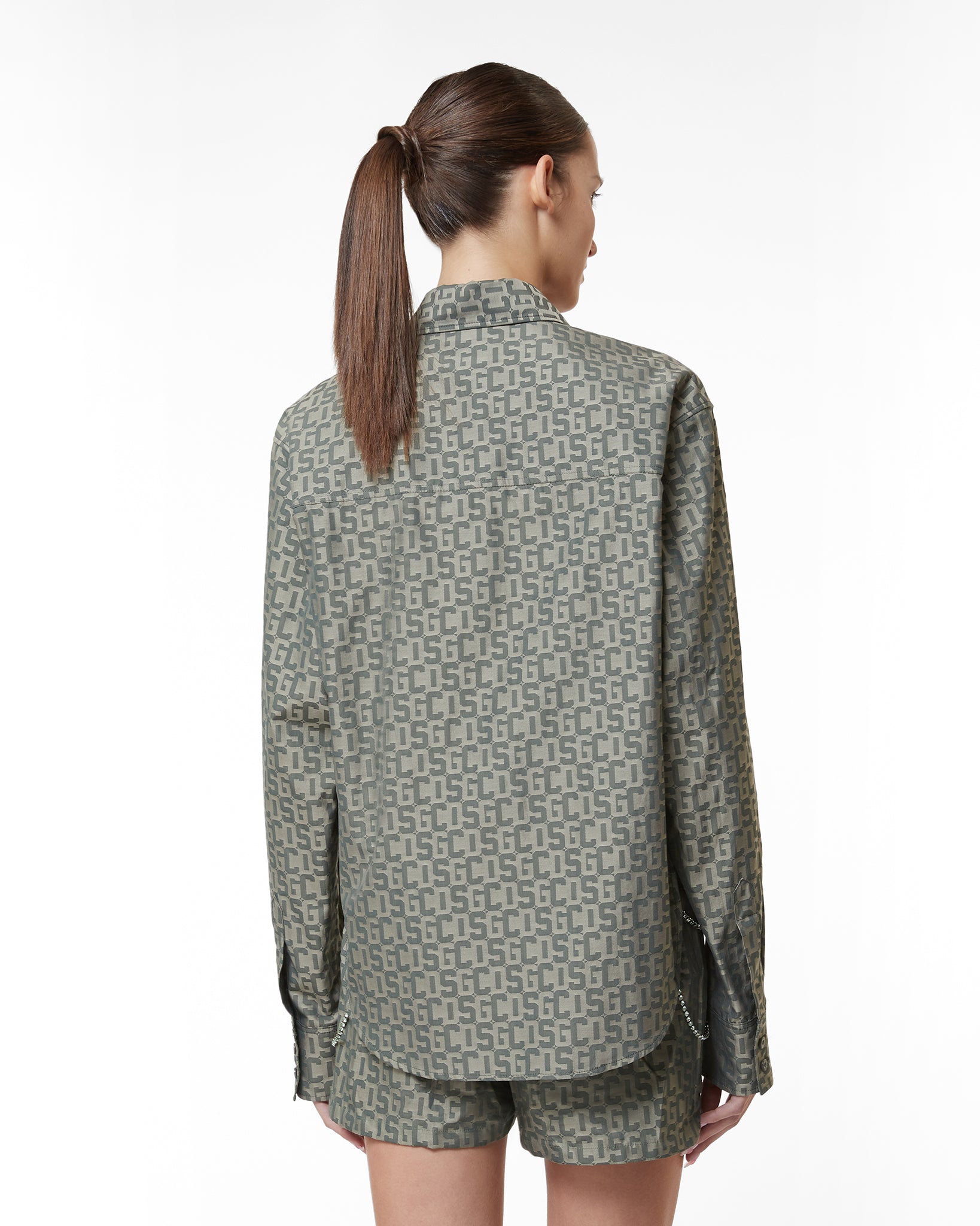 Two-tone monogram GCDS cotton shirt with side slits decorated with a cup chain. Asymmetrical rounded bottom which is longer on the back. Over-sized.