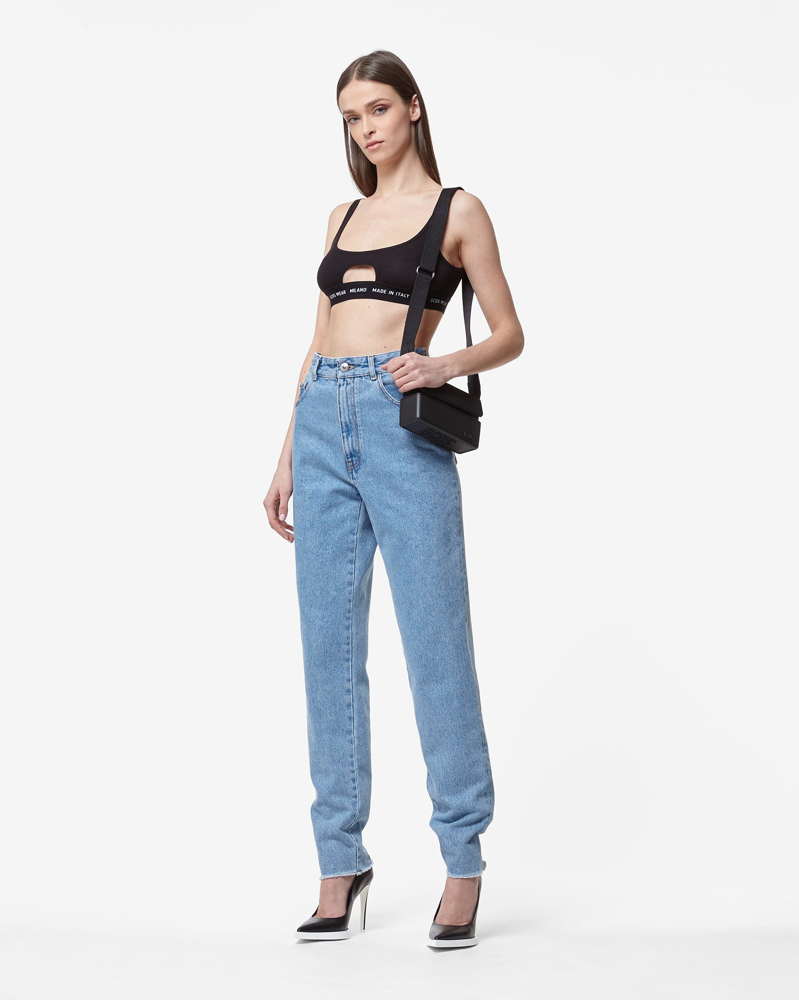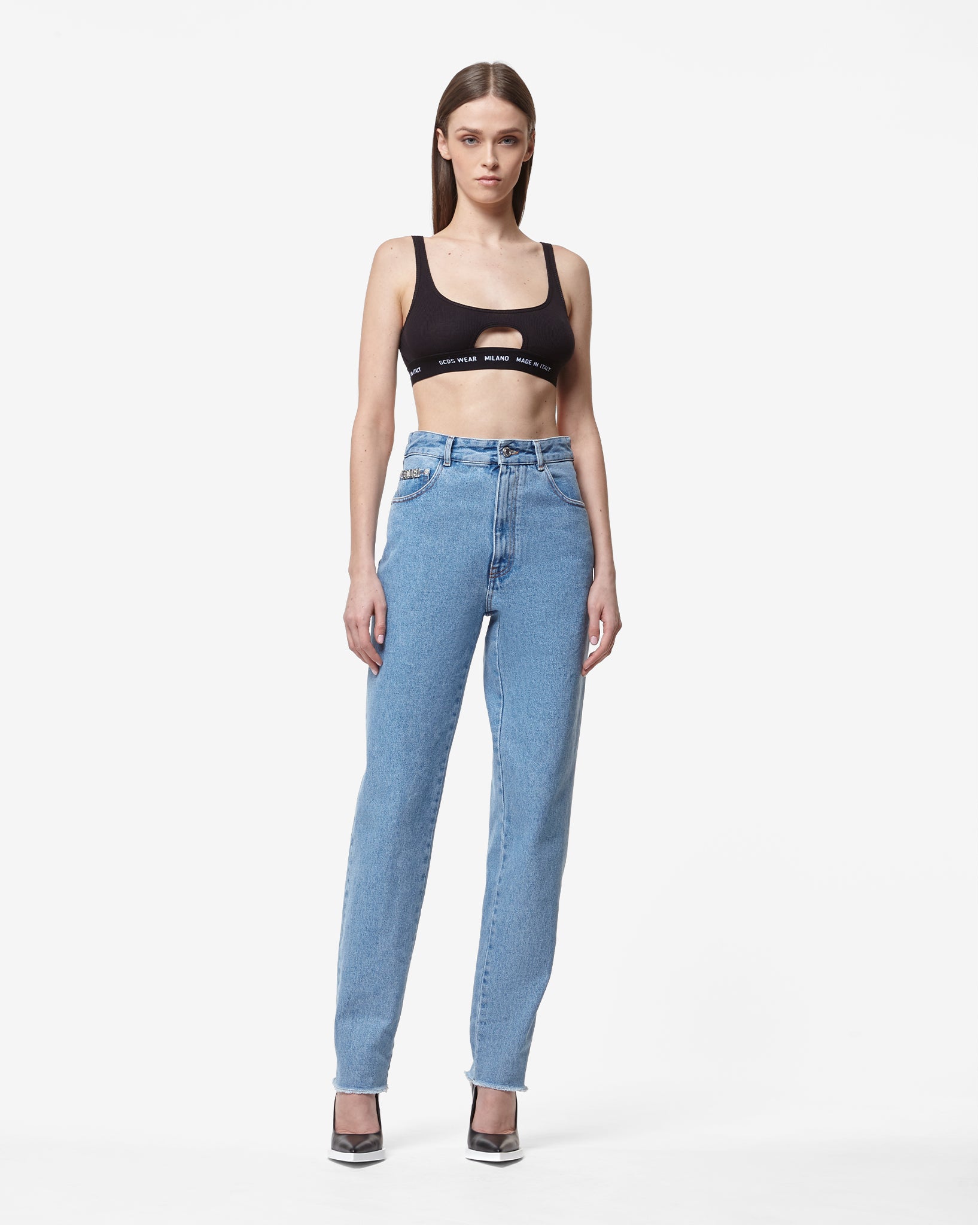 High-waisted light stone washed and bleached denim jeans. Contrasting tobacco-colored topstitching. Crystal GCDS logo choker on the back at the waist. Straight leg cut.