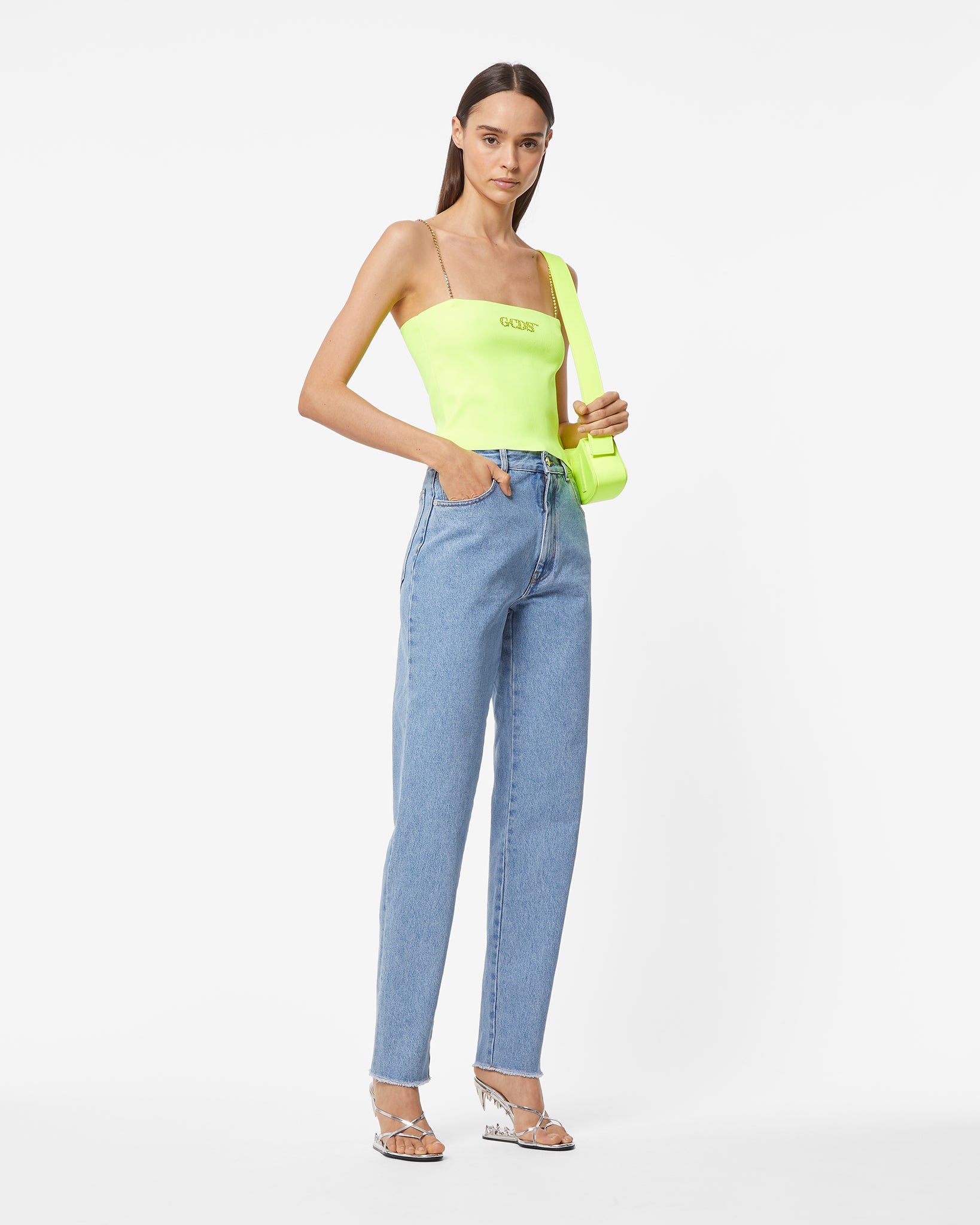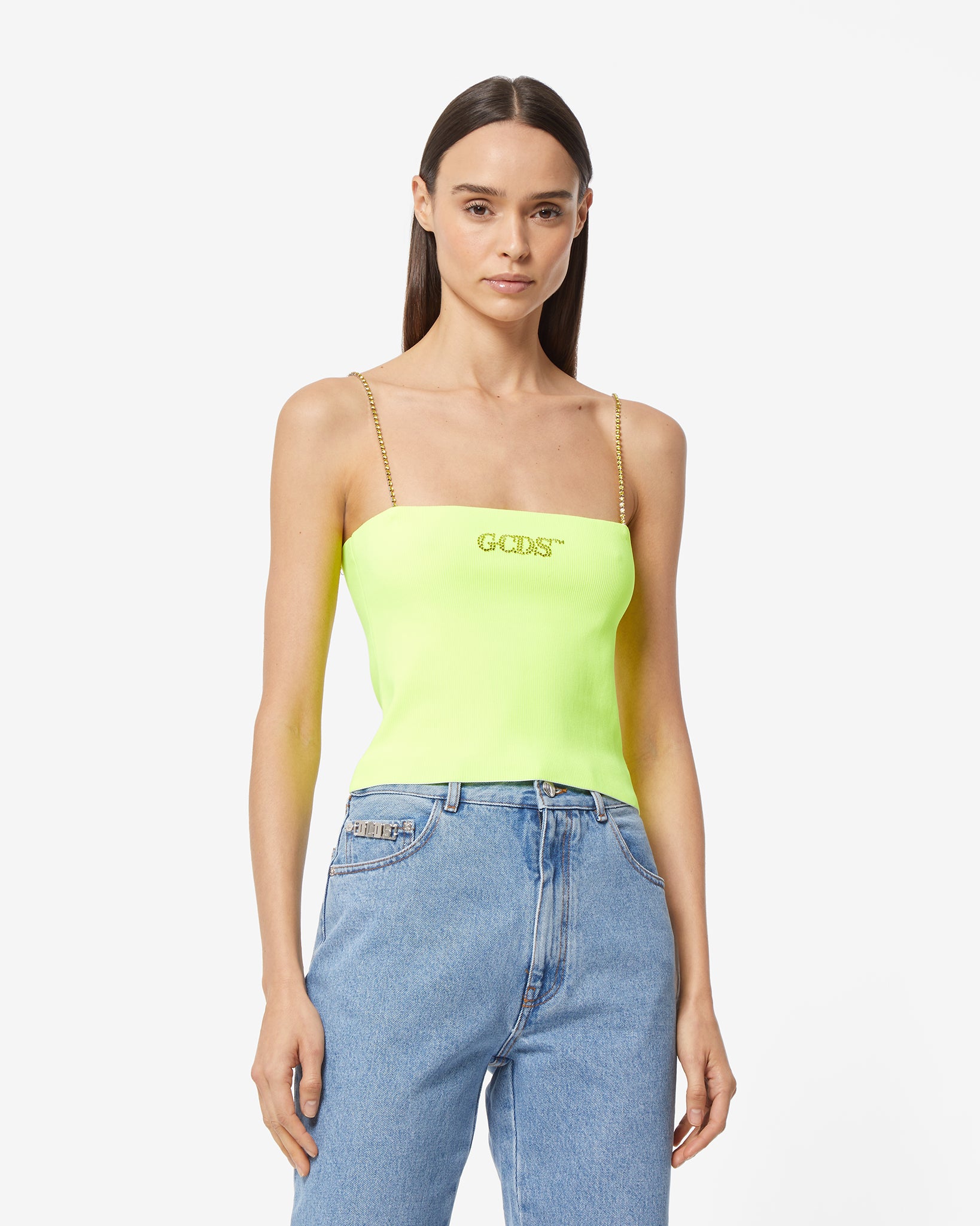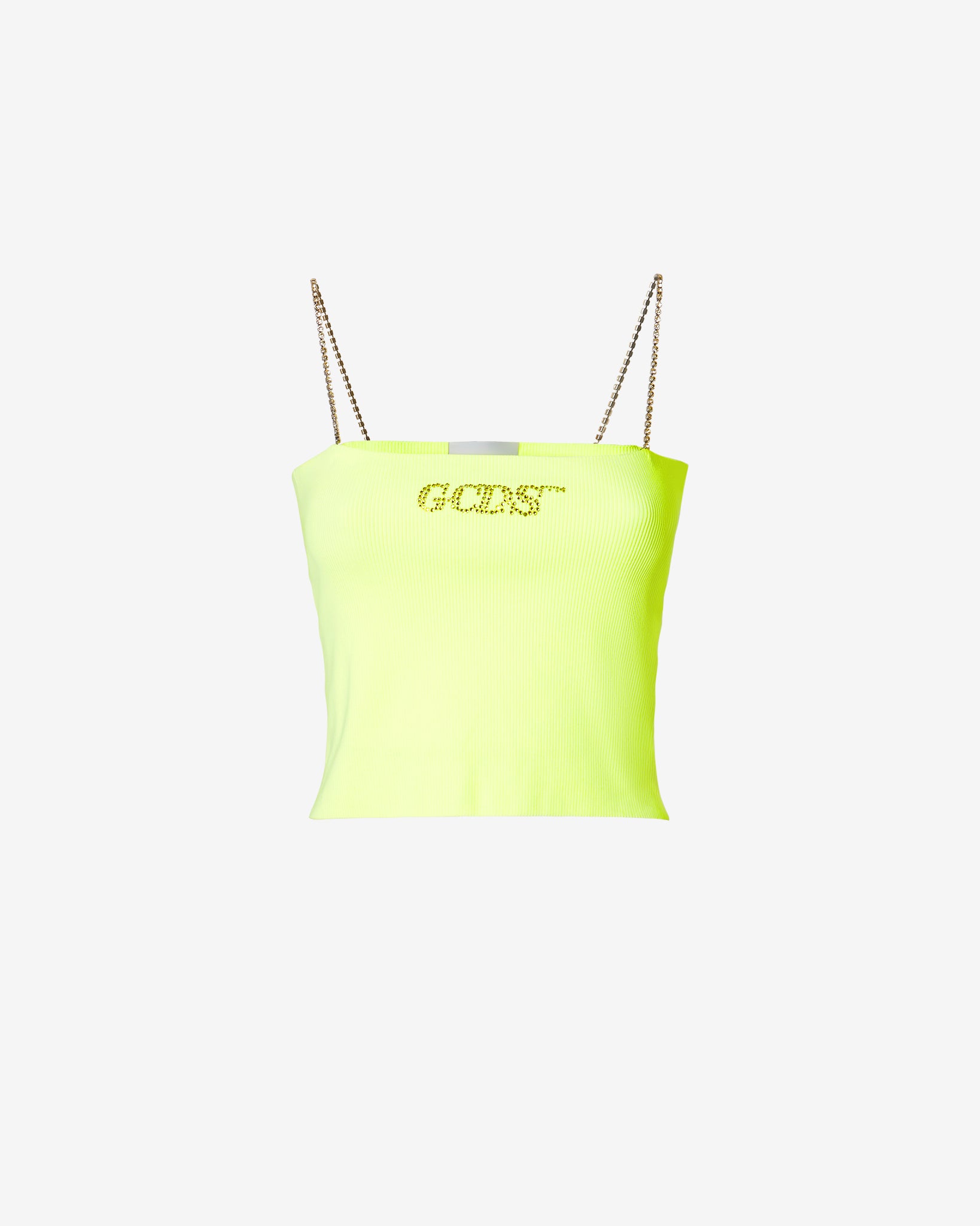 Technical solid knit mini top with band. Logo detailing in tone-on-tone heat-applied crystals on the center front. Shoulder strap with chain of tone-on-tone stones.