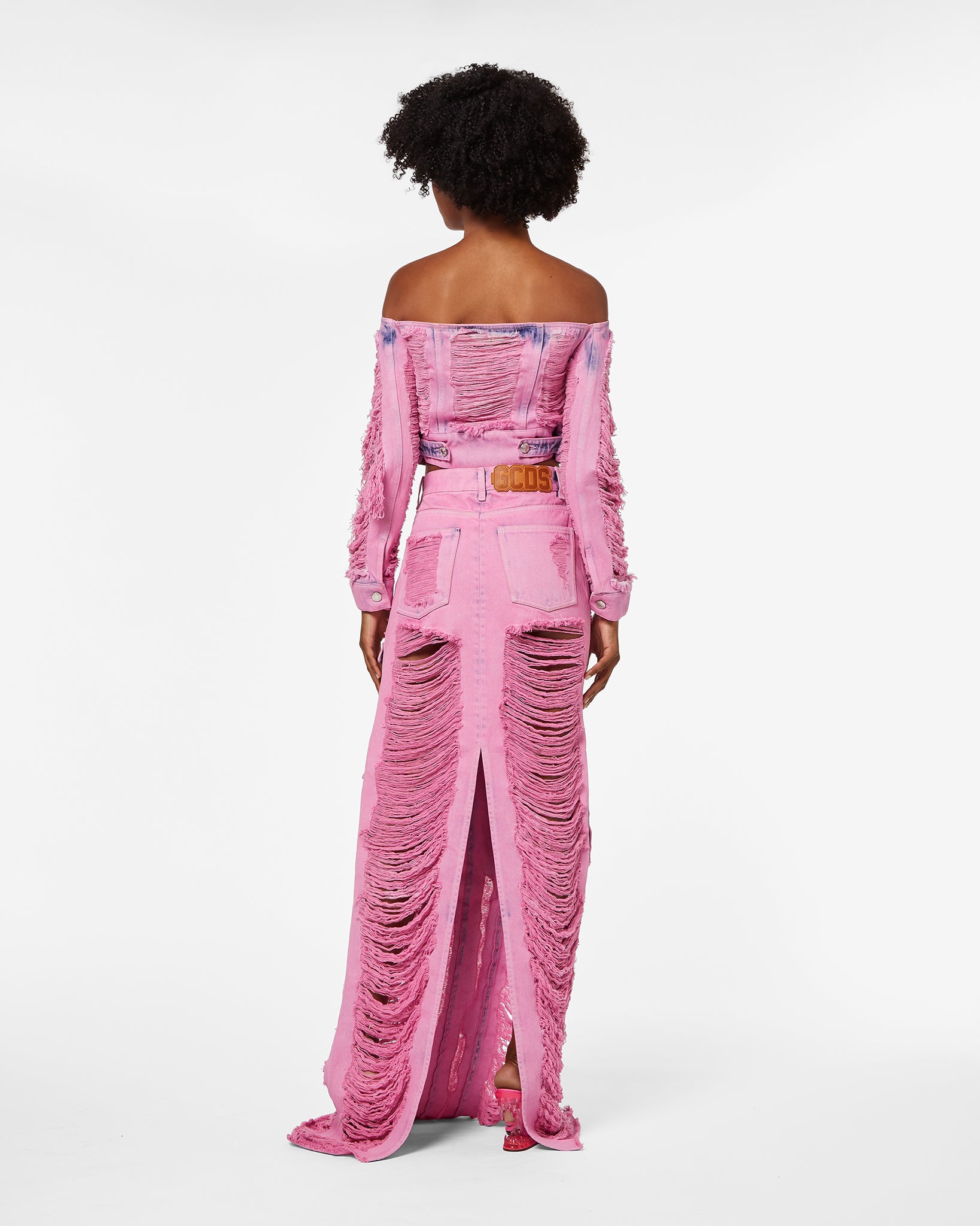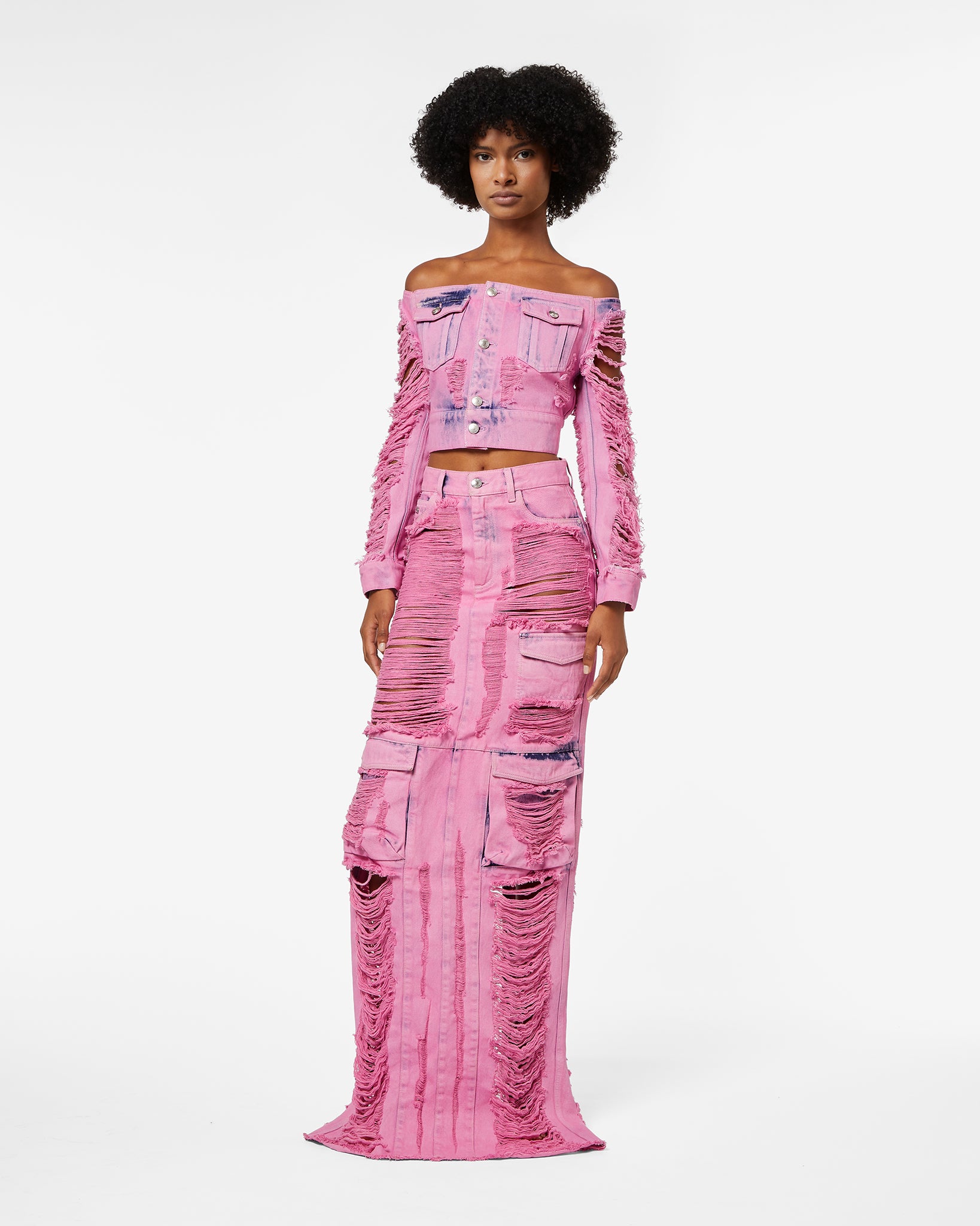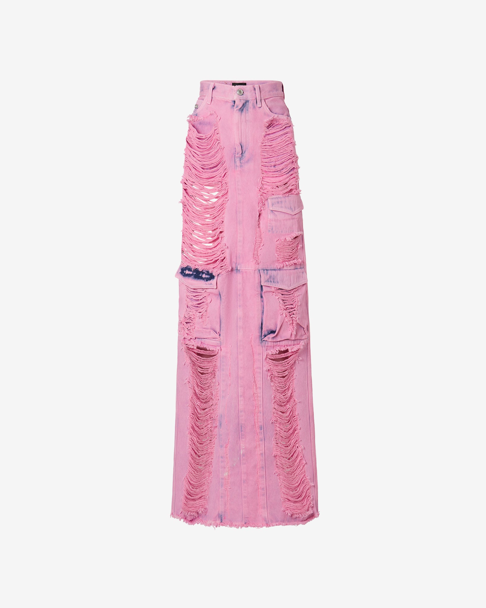 Pink overdyed denim maxi cargo skirt with ripped details.