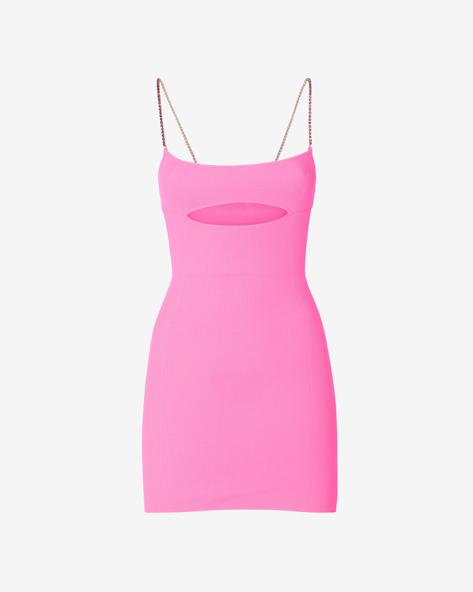 Technical solid knit mini dress. Opening on the front. Logo detailing in tone-on-tone heat-applied crystals on the center back. Shoulder strap with chain of tone-on-tone stones.