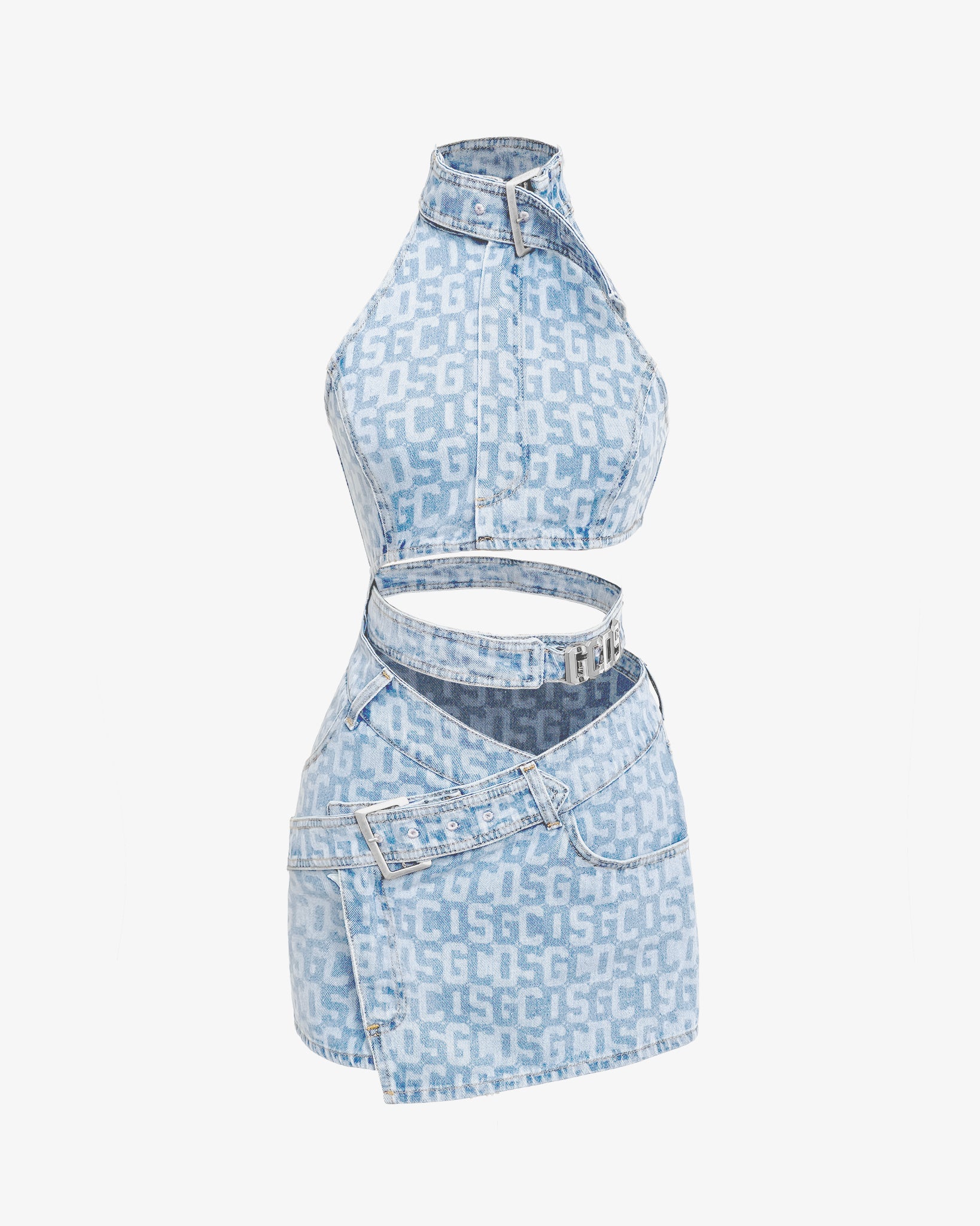Mini abito halterneck in denim laserato con pattern Gcds Monogram e cuciture a contrasto color tabacco. Doppia chiusura frontale con zip nascoste e cinture con fibbia squadrata. Il dettaglio distintivo è dato dal cut-out e dalla cintura in denim con fibbia a spillo con logo GCDS argento.