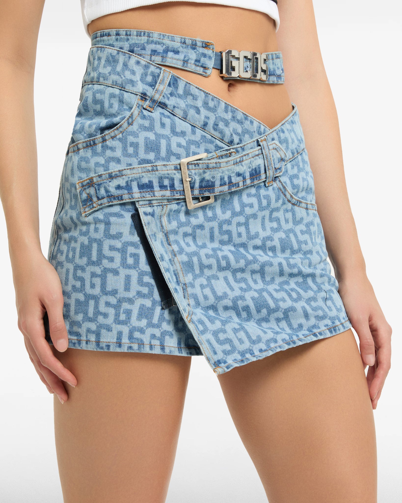 Minigonna in denim con monogram realizzato a laser e cuciture a contrasto color tabacco. Doppia chiusura frontale con zip a scomparsa e cintura con fibbia quadrata. Il dettaglio distintivo è la cintura in denim con fibbia argentata con logo GCDS.