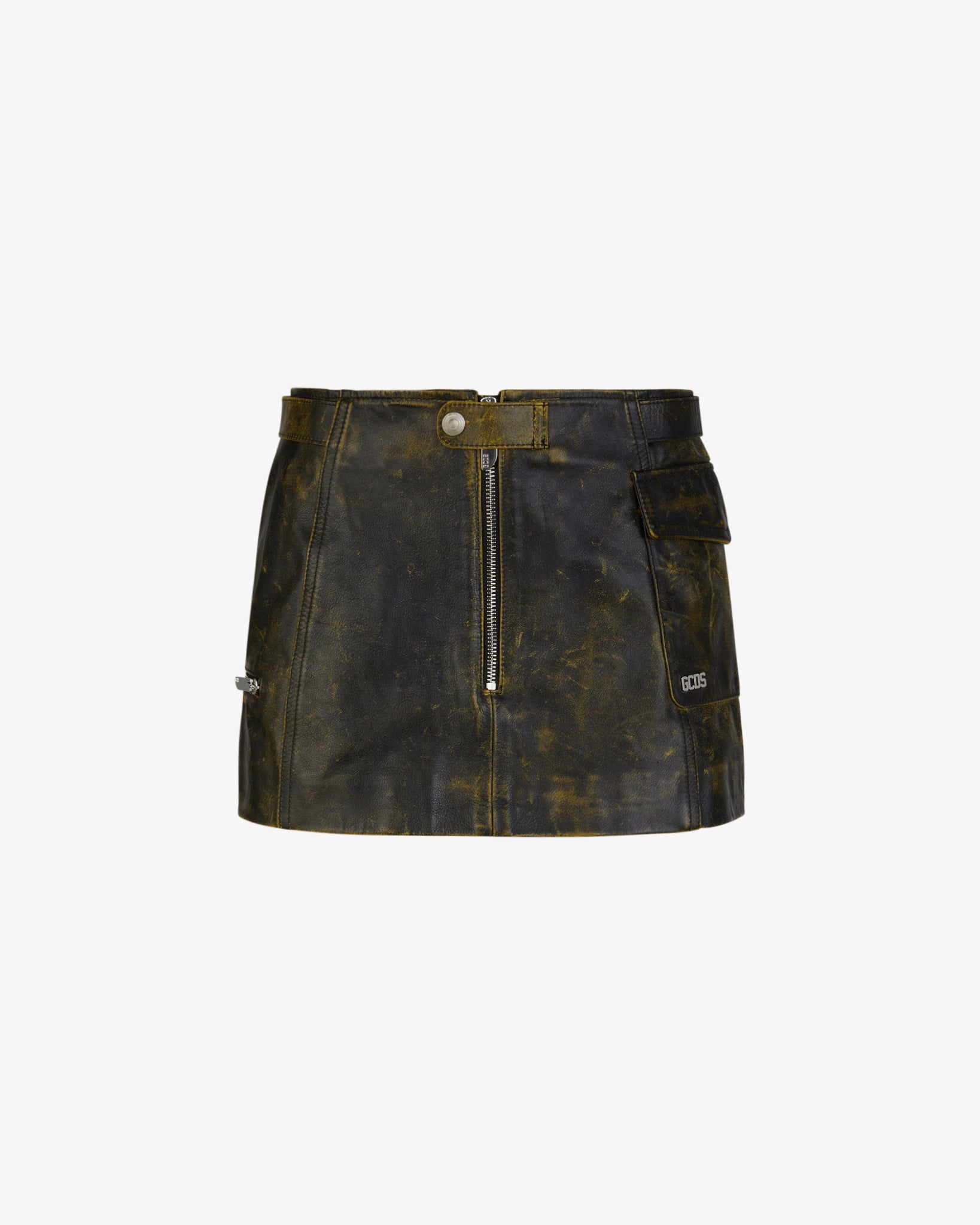 Minigonna biker realizzata in pelle trattata per un effetto consumato. Presenta un dettaglio GCDS metallico, una cerniera in nichel lucido e una tasca applicata.