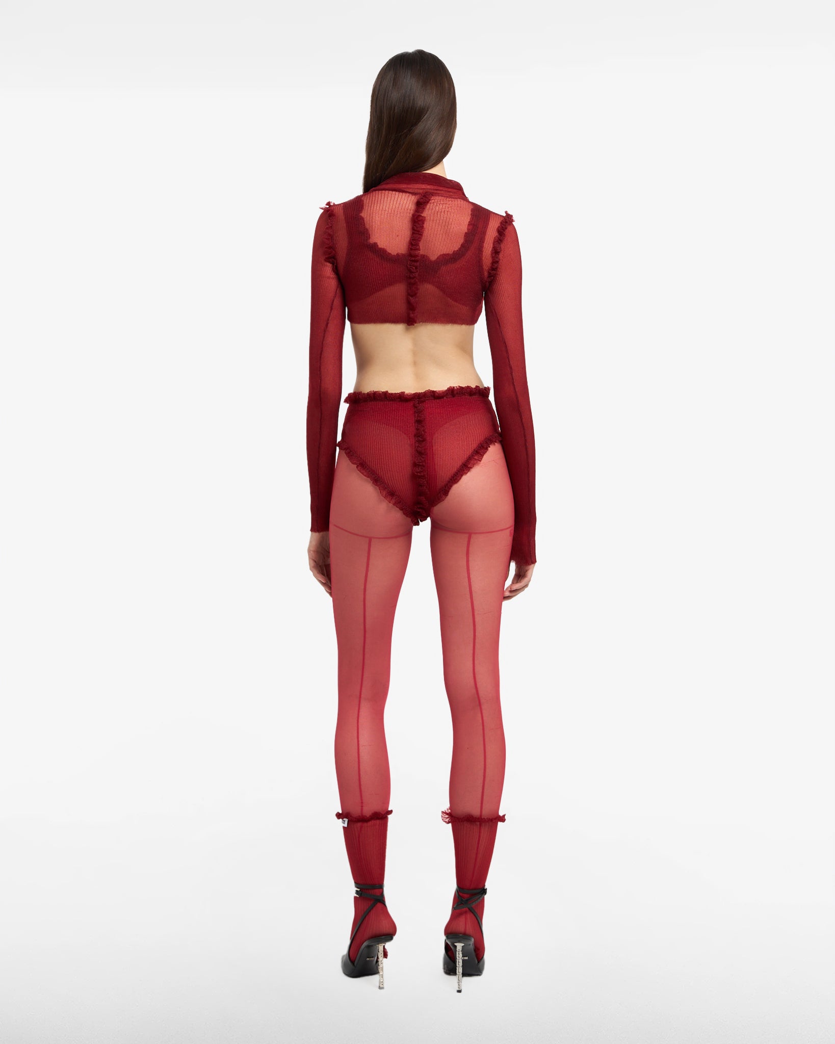 Pantaloncini ultra corti in maglieria stretch, realizzati in maglia leggera ed elasticizzata, presentano una struttura a coste per una vestibilità perfetta. Adornati da un'etichetta jacquard con il logo GCDS in vita, presentano ruches applicate sull'orlo.